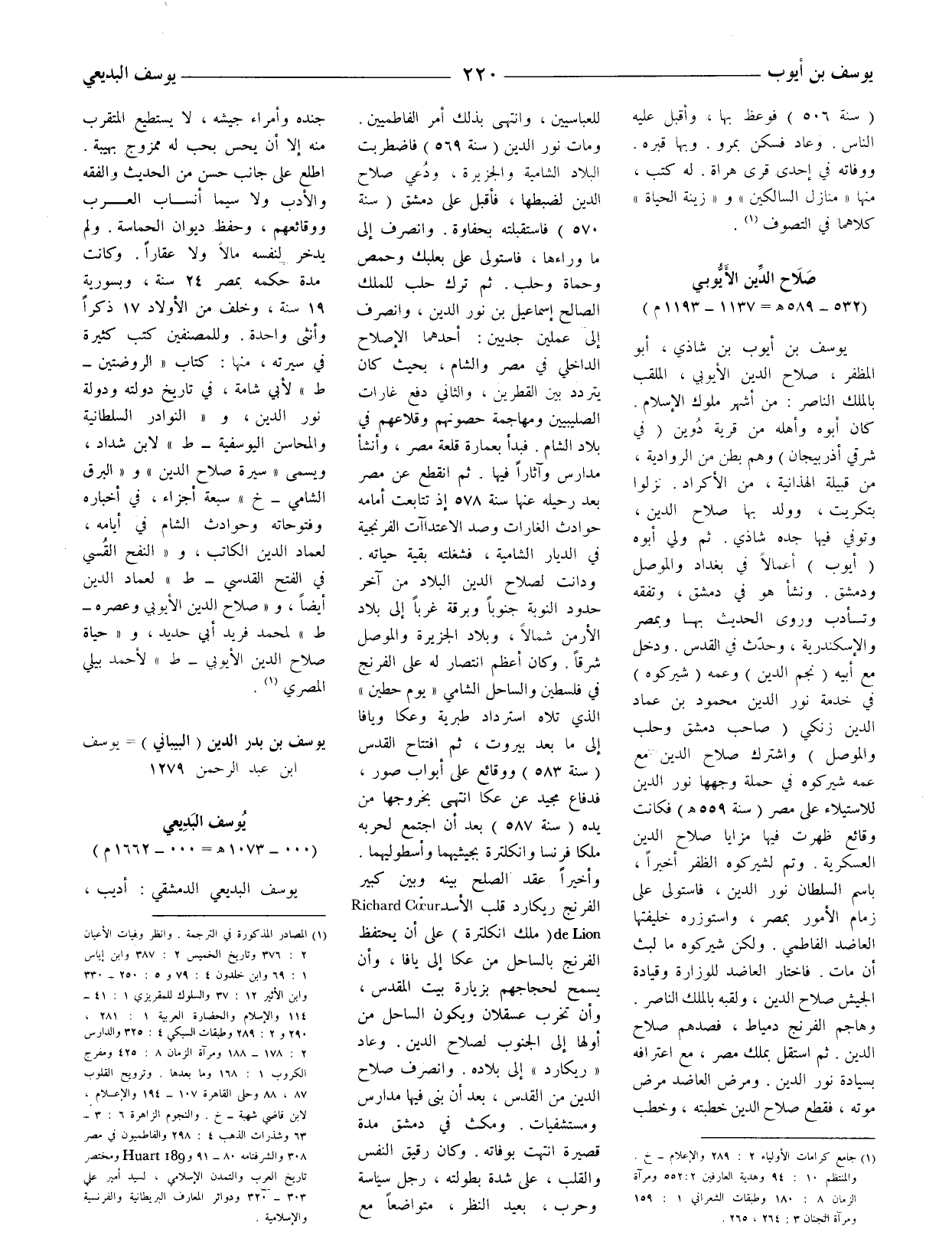 (1) المصادر المذكورة في الترجمة. وانظر وفيات الأعيان 2: 376 وتاريخ الخميس 2: 387 وابن إياس 1: 69 وابن خلدون 4: 79 و 5: 250 - 330 وابن الأثير 12: 37 والسلوك للمقريزي 1: 41 - 114 والإسلام والحضارة العربية 1: 281، 290 و 2: 289 وطبقات السبكي 4: 325 والدارس 2: 178 - 188 ومرآة الزمان 8: 425 ومفرج الكروب 1: 168 وما بعدها. وترويح القلوب 87، 88 وحلى القاهرة 107 - 194 والإعلام، لابن قاضي شهبة - خ. والنجوم الزاهرة 6: 3 - 63 وشذرات الذهب 4: 298 والفاطميون في مصر 308 والشرفنامه 80 - 91 و 189 Huart ومختصر تاريخ العرب والتمدن الإسلامي، لسيد أمير علي 303 - 320 ودوائر المعارف البريطانية والفرنسية والإسلامية.