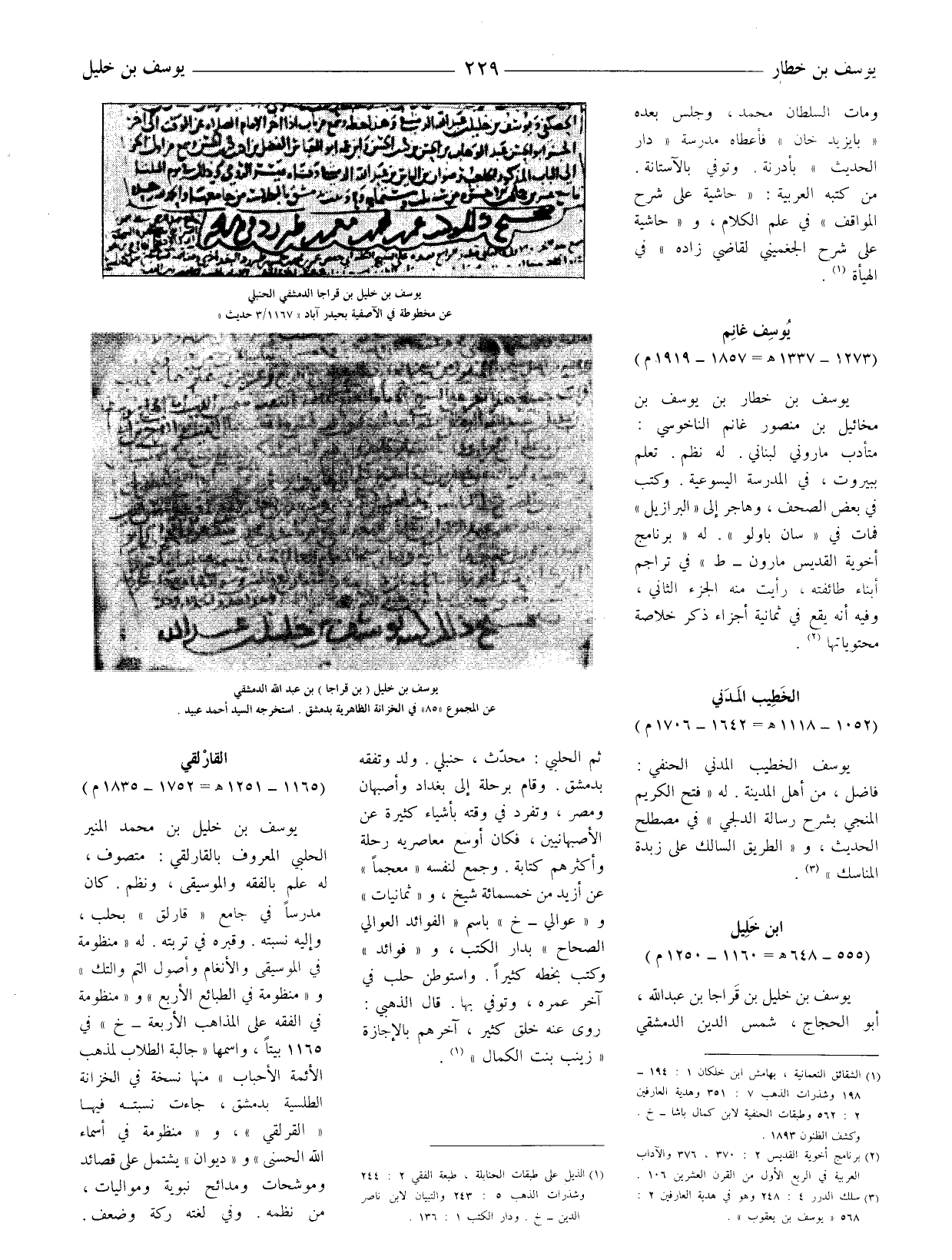 يوسف الخطيب المَدَني الحنفي: فاضل، من أهل المدينة. له " فتح الكريم المنجي بشرح رسالة الدلجي " في مصطلح الحديث، و " الطريق السالك على زبدة المناسك " (3) .