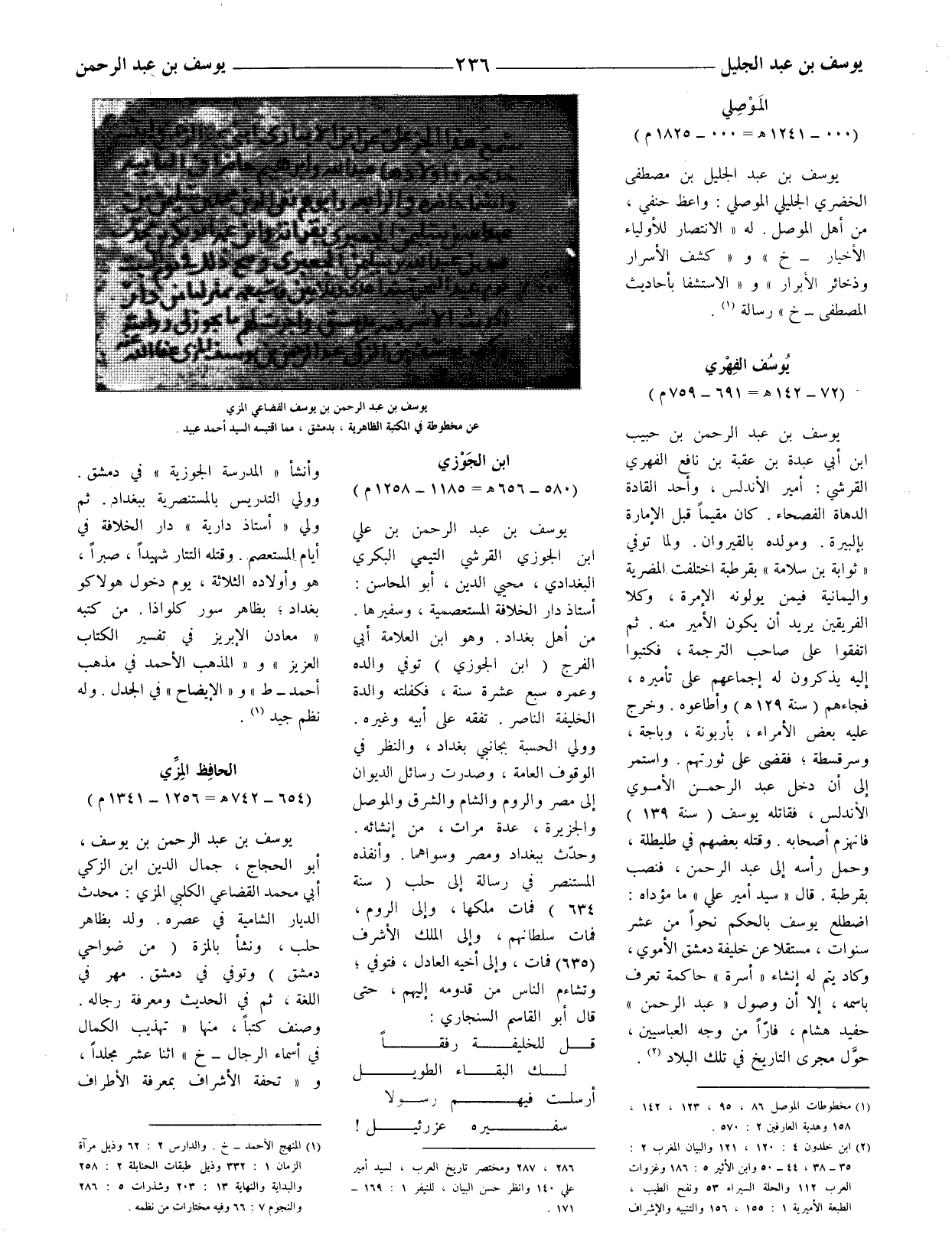 يوسف بن عبد الرحمن بن حبيب ابن أبي عَبْدَة بن عقبة بن نافع الفهري القرشي: أمير الأندلس، وأحد القادة الدهاة الفصحاء. كان مقيما قبل الإمارة بإلبيرة. ومولده بالقيروان. ولما توفي " ثوابة بن سلامة " بقرطبة اختلفت المضرية واليمانية فيمن يولونه الإمرة، وكلا الفريقين يريد أن يكون الأمير منه. ثم اتفقوا على صاحب الترجمة، فكتبوا إليه يذكرون له إجماعهم على تأميره، فجاءهم (سنة 129 هـ وأطاعوه. وخرج عليه بعض الأمراء، بأربونة، وباجة، وسرقسطة، فقضى على ثورتهم. واستمر إلى أن دخل عبد الرحمن الأموي الأندلس، فقاتله يوسف (سنة 139) فانهزم أصحابه. وقتله بعضهم في طليطلة، وحمل رأسه إلى عبد الرحمن، فنصب بقرطبة. قال " سيد أمير علي " ما مؤداه: اضطلع يوسف بالحكم نحوا من عشر سنوات، مستقلا عن خليفة دمشق الأموي، وكاد يتم له إنشاء " أسرة " حاكمة تعرف باسمه، إلا أن وصول " عبد الرحمن " حفيد هشام، فارامن وجه العباسيين، حوَّل مجرى التاريخ في تلك البلاد (2) .