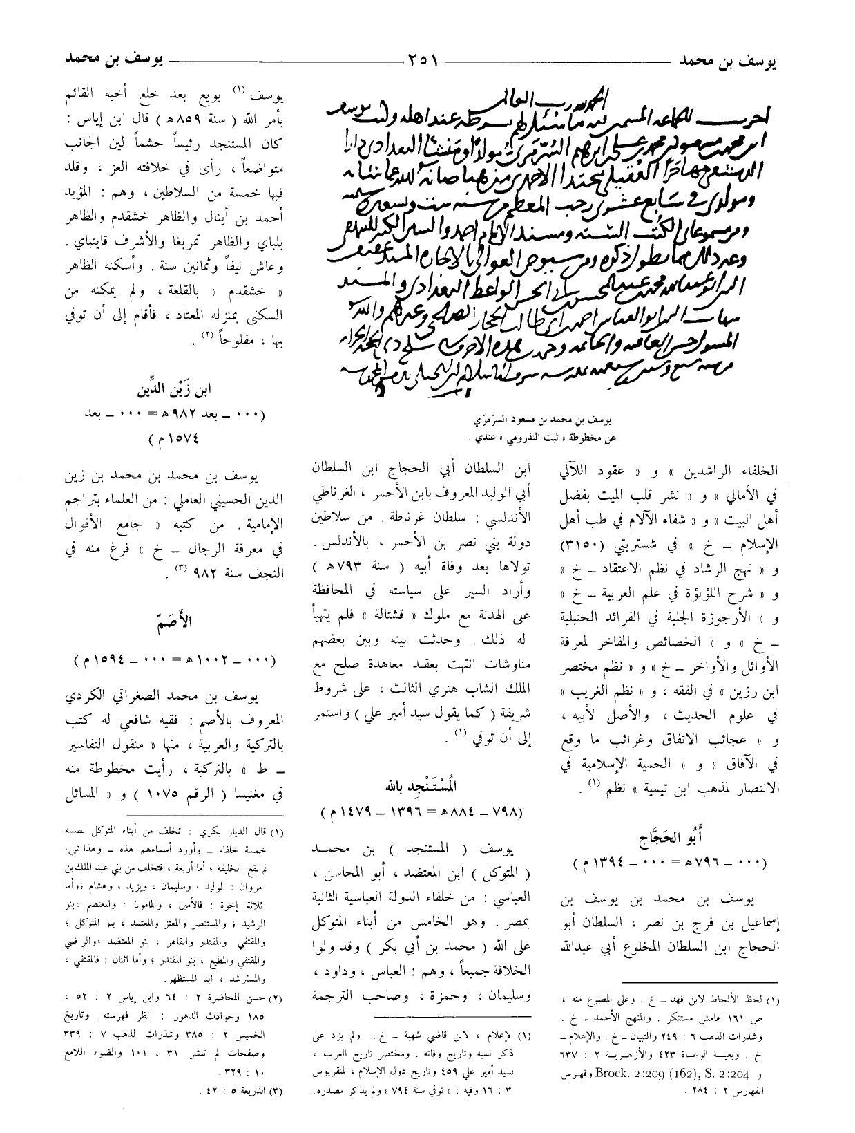 (1) الإعلام، لابن قاضي شهبة - خ. ولم يرد على ذكر نسبه وتاريخ وفاته. ومختصر تاريخ العرب، لسيد أمير علي 459 وتاريخ دول الإسلام، لمنقريوس 3: 16 وفيه: " توفي سنة 794 " ولم يذكر مصدره.