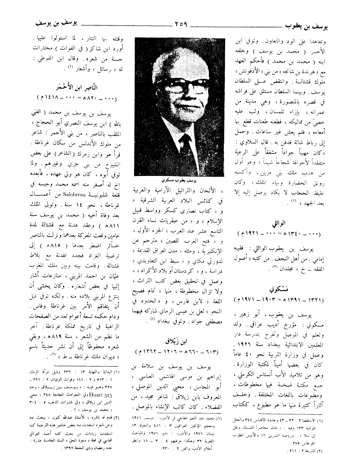 يوسف بن يعقوب، أبو زهير، مسكوني: مؤرخ أديب عراقي. ولد وتعلم في الموصل وتخرج بمدرسة دار المعلمين الابتدائية ببغداد سنة 1926. وعمل في وزارة التربية نحو 4 0 عاما كان في بعضها أمينا لمكتبة الوزارة. وهو من تلاميذ الأب أنستاس الكرملي، جمع مكتبة ضخمة فيها مخطوطات، ومطبوعات باللغات المختلفة. وخلف آثار كثيرة منها ما هو مطبوع، ككتاب