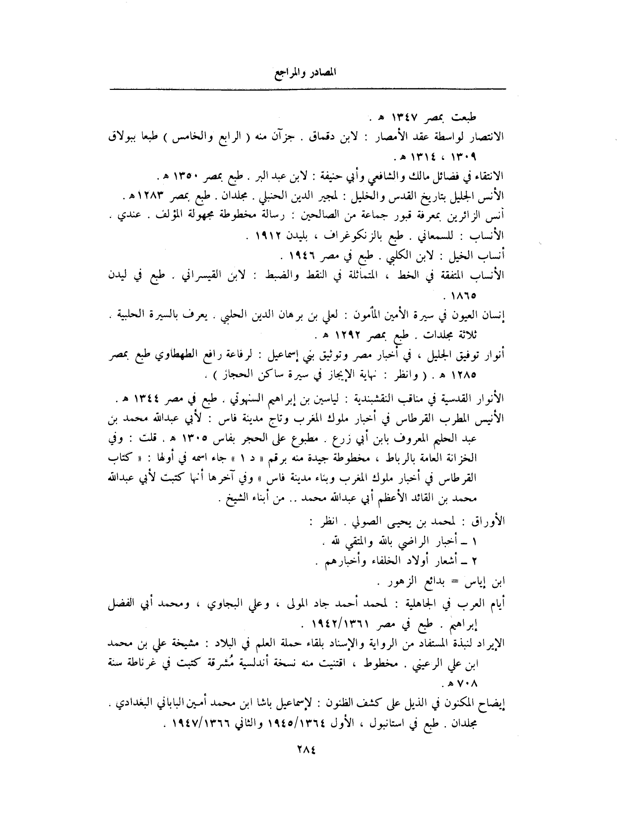 الأنيس المطرب القرطاس في أخبار ملوك المغرب وتاج مدينة فاس: ل أبي عبد الله محمد بن عبد الحليم المعروف بابن أبي زرع. مطبوع على الحجر بفاس 1305 هـ