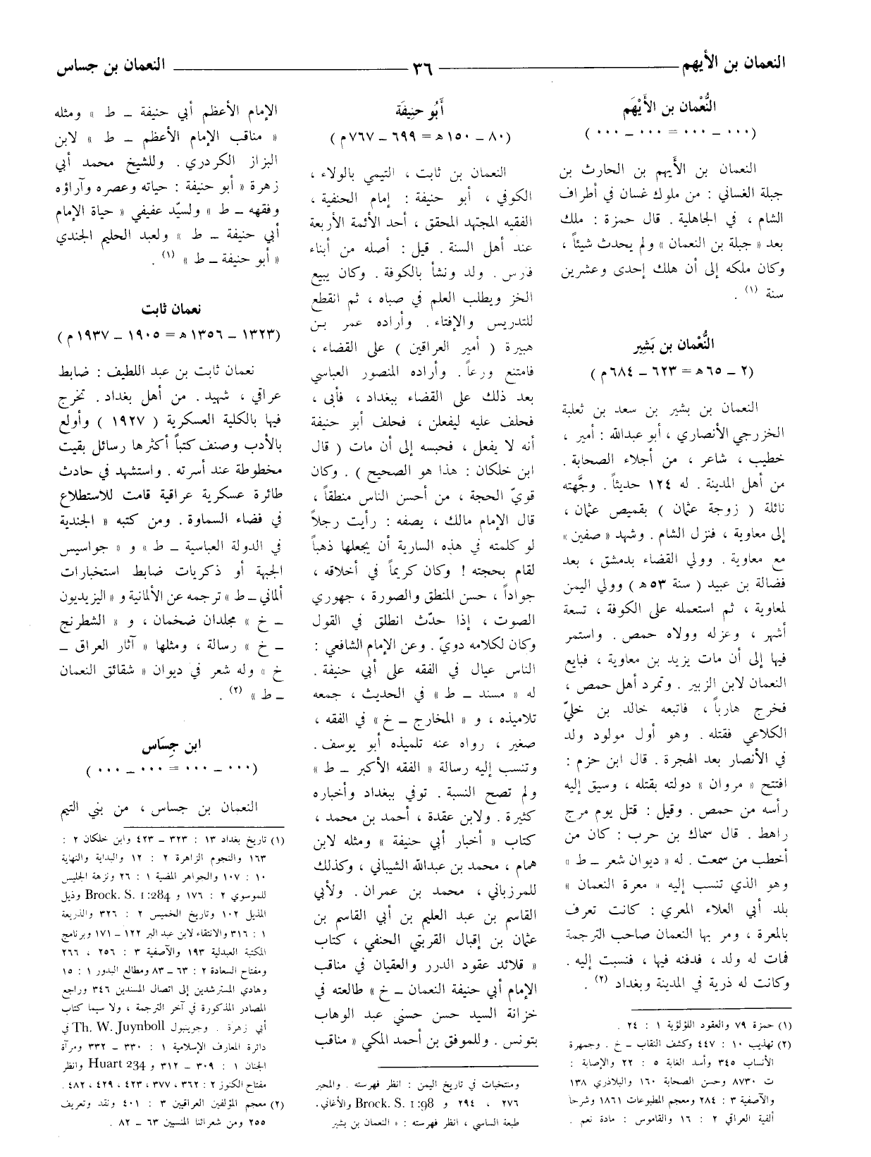النعمان بن ثابت، التيمي بالولاء، الكوفي، أبو حنيفة: إمام الحنفية، الفقيه المجتهد المحقق، أحد الأئمة الأربعة عند أهل السنة. قيل: أصله من أبناء فارس. ولد ونشأ بالكوفة. وكان يبيع الخز ويطلب العلم في صباه، ثم انقطع للتدريس والإفتاء. وأراده عمر بن هبيرة (أمير العراقين) على القضاء، فامتنع ورعا. وأراده المنصور العباسي بعد ذلك على القضاء ببغداد، فأبى، فحلف عليه ليفعلن، فحلف أبو حنيفة أنه لا يفعل، فحبسه إلى أن مات (قال ابن خلكان: هذا هو الصحيح) .