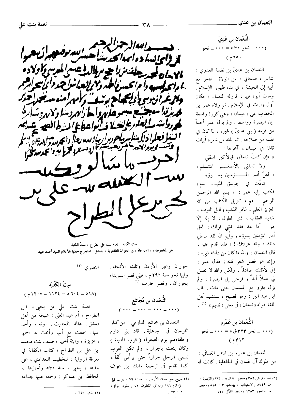 النعمان بن عديّ بن نضلة العدوي: شاعر، صحابي، من الولاة. هاجر مع أبيه إلى الحبشة، في بدء ظهور الإسلام. ومات أبوه فيها، فورثه النعمان، فكان أول وارث في الإسلام. ثم ولاه