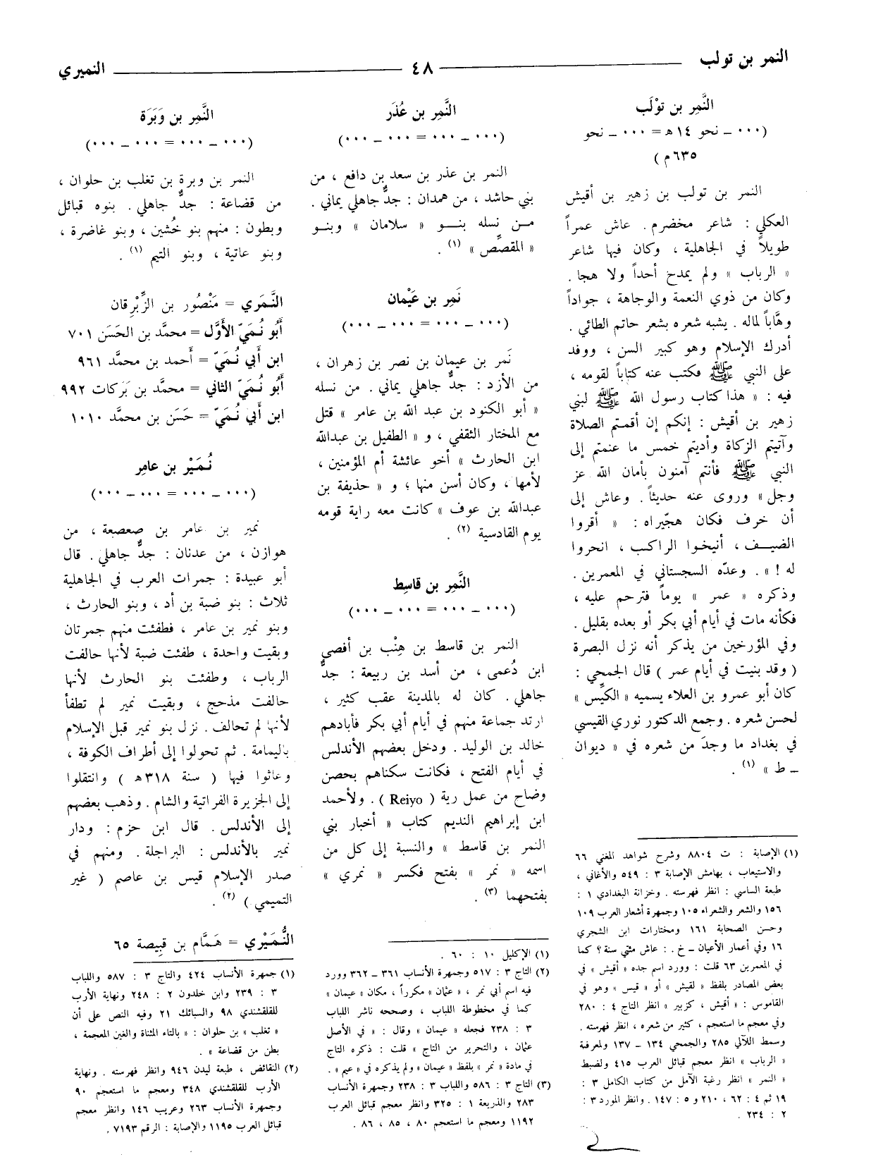 (2) التاج 3: 517 وجمهرة الأنساب 361 - 362 وورد فيه اسم أبي نمر، " عثمان " مكررا، مكان " عيمان " كما في مخطوطة اللباب، وصححه ناشر اللباب 3: 238 فجعله " عيمان " وقال: " في الأصل عثمان، والتحرير من التاج " قلت: ذكره التاج في مادة " نمر " بلفظ " عيمان " ولم يذكره في " عيم ".
