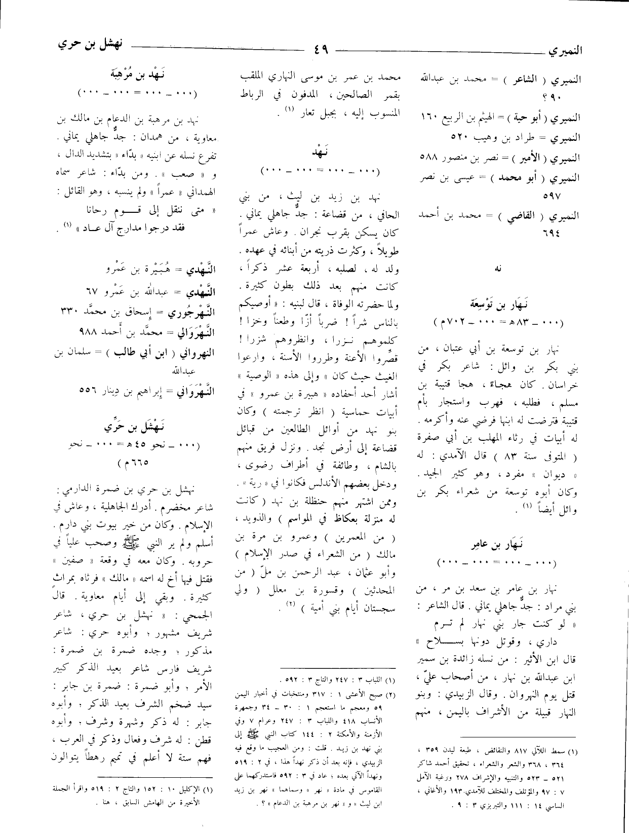 (2) صبح الأعشى 1: 317 ومنتخبات في أخبار اليمن 59 ومعجم ما استعجم 1: 30 - 34 وجمهرة الأنساب 418 واللباب 3: 247 وعرام 7 وفي الأزمنة والأمكنة 2: 144 كتاب النبي صلّى الله عليه وسلم إلى بني نهد بن زيد. قلت: ومن العجيب ما وقع فيه الزبيدي، فإنه بعد أن ذكر نهدا هذا، في 2: 519 ونهدا الآتي بعده، عاد في 3: 592 فاستدركهما على القاموس في مادة " نهر " وسماهما " نهر بن زيد ابن ليث " و " نهر بن مرهبة بن الدعام "؟.