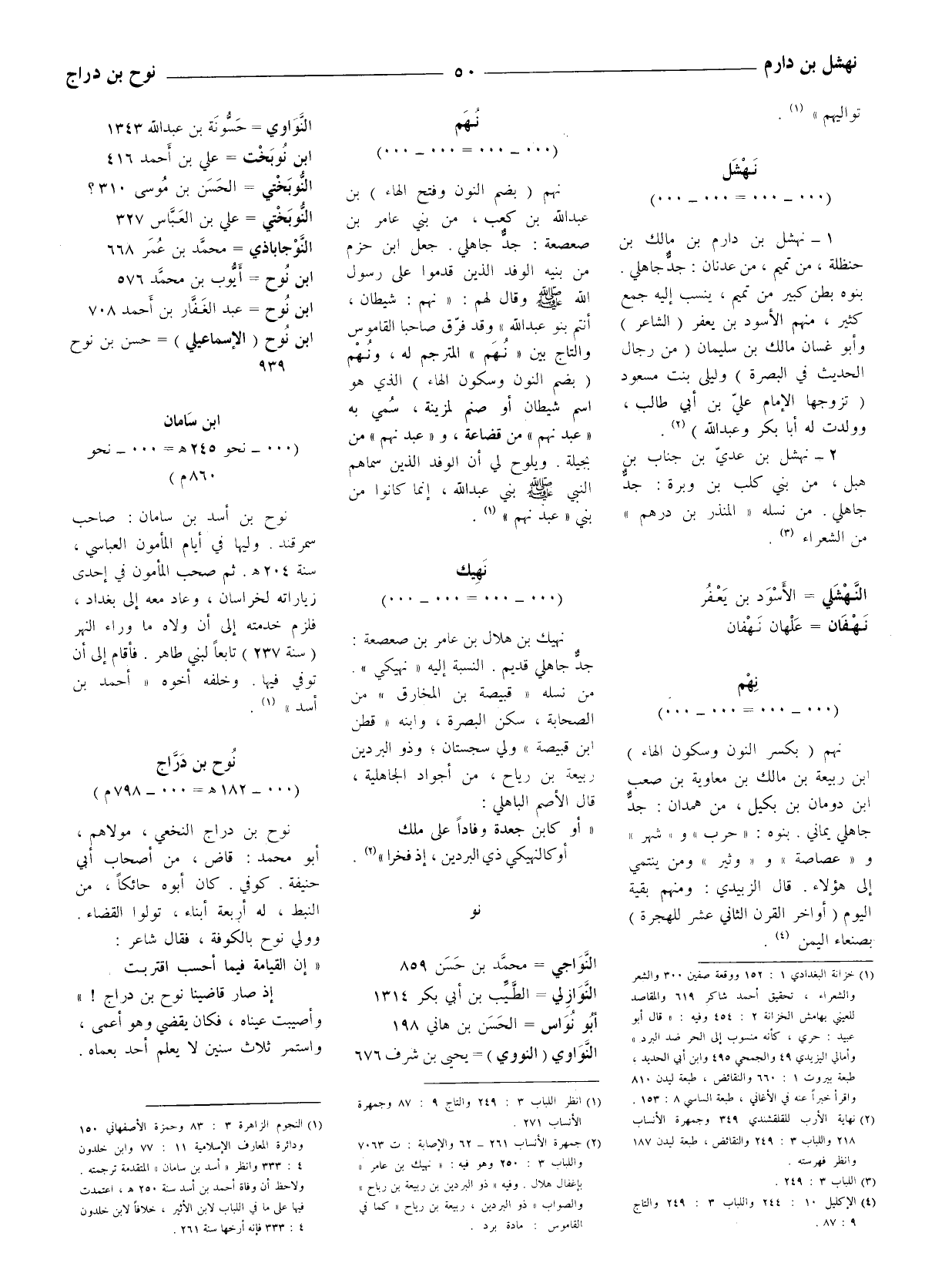 1 - نهشل بن دارم بن مالك بن حنظلة، من تميم، من عدنان: جدّ جاهلي. بنوه بطن كبير من تميم، ينسب إليه جمع كثير، منهم الأسود بن يعفر (الشاعر) وأبو غسان مالك بن سليمان (من رجال الحديث في البصرة) وليلى بنت مسعود (تزوجها الإمام عليّ بن أبي طالب، وولدت له أبا بكر وعبد الله) (2) .