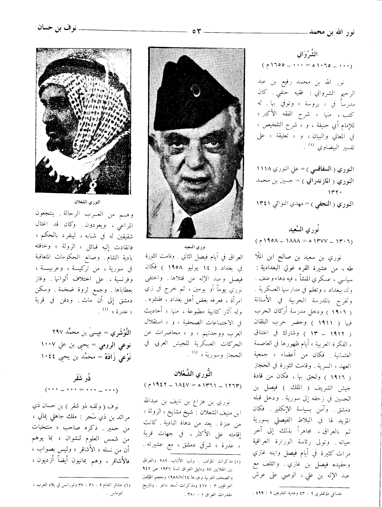 نوري بن سعيد بن صالح ابن الملّا طه، من عشيرة القره غولي البغدادية: سياسي، عسكري المنشأ، فيه دهاء وعنف. ولد ببغداد، وتعلم في مدارسها العسكرية. وتخرج بالمدرسة الحربية في الأستانة (1906) ودخل مدرسة أركان الحرب فيها (1911) وحضر حرب البلقان (1912 - 13) وشارك في اعتناق " الفكرة العربية " أيام ظهورها في العاصمة العثمانية. فكان من أعضاء " جمعية العهد " السرية. وقامت الثورة في الحجاز (1916) ولحق بها، فكان من قادة جيش الشريف (الملك) فيصل بن الحسين في زحفه إلى سورية. ودخل قبله دمشق. وآمن بسياسة الإنكليز. فكان المؤيد لها في البلاط الفيصلي بسورية ثم بالعراق، مجاهرا بذلك إلى آخر حياته. وتولى رئاسة الوزارة العراقية مرات كثيرة في أيام فيصل وابنه غازي وحفيده فيصل بن غازي.