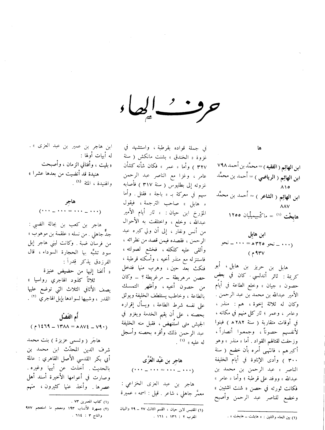 سهم في معركة ب " باجة " فقتل. وأما " هابل " صاحب الترجمة، فيقول المؤرخ ابن حيان: " ثار أيام الأمير عبد الله، وخلع، واختلفت به الأحوال من أنس ونفار، إلى أن ولي كبره عبد الرحمن، فقصده فيمن قصد من نظرائه، وألقى عليه كلكله، فخشع لصولته، فاستنزله مع منذر أخيه، وأسكنه قرطبة، فنكث بعد حين، وهرب منها فدخل حصن مرهريطة - مرغريطة؟ - وكان من حصون أخيه، وأظهر التمسك بالطاعة، وخاطب يستلطف الخليفة ويوثق على نفسه شرط الطاعة، ويسأل إقراره بحصنه، على أن يقيم الخدمة ويغزو في الجيش متى استنهض، فقبل منه الخليفة عبد الرحمن ذلك وأقره بحصنه وأسجل له عليه " (1) .