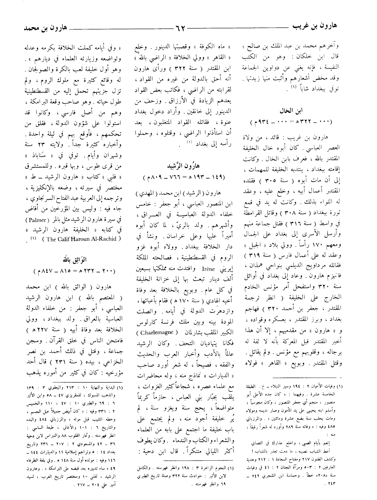 " وفي أيامه كملت الخلافة بكرمه وعدله وتواضعه وزيارته العلماء في ديارهم ". وهو أول خليفة لعب بالكرة والصولجان. له وقائع كثيرة مع ملوك الروم، ولم تزل جزيتهم تحمل إليه من القسطنطينية طول حياته. وهو صاحب وقعة البرامكة، وهم من أصل فارسي، وكانوا قد استولوا على شؤون الدولة، فقلق من تحكمهم، فأوقع بهم في ليلة واحدة. وأخباره كثيرة جدا. ولايته 23 سنة وشهران وأيام. توفي في " سَناباذ " من قرى طوس، وبها قبره. وللمستشرق " فلبي " كتاب " هارون الرشيد - ط " مختصر في سيرته، وضعه بالإنكليزية، وترجمه إلى العربية عبد الفتاح السرنجاوي، جاء فيه: وليس بين المؤرخين من أفاض في سيرة هارون الرشيد مثل بالمر (Palmer) في كتابه " الخليفة هارون الرشيد " (The Calif Haroun Al - Rachid) (1)