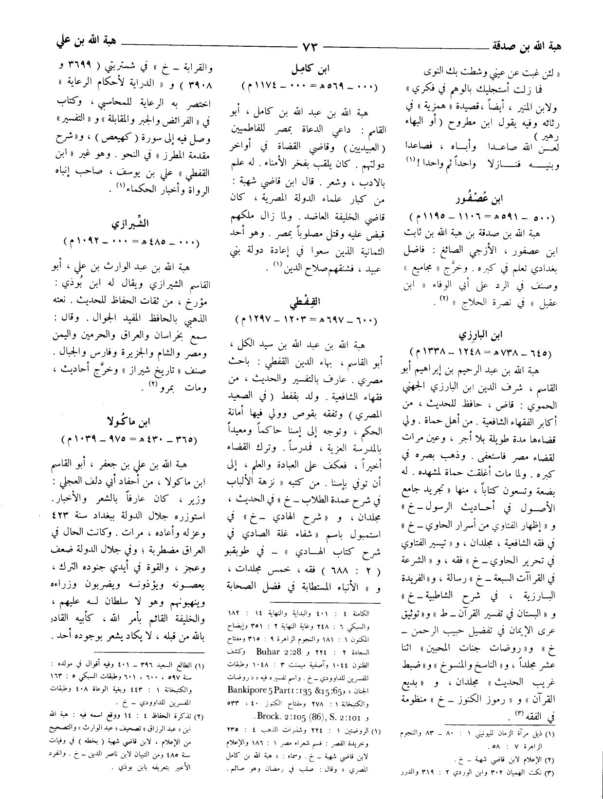 (1) الروضتين 1: 224 وشذرات الذهب 4: 235 وخريدة القصر: قسم شعراء مصر 1: 186 والإعلام لابن قاضي شهبة - خ. وسماه: " هبة الله بن كامل المصري " وقال: صلب في رمضان وهو صائم.