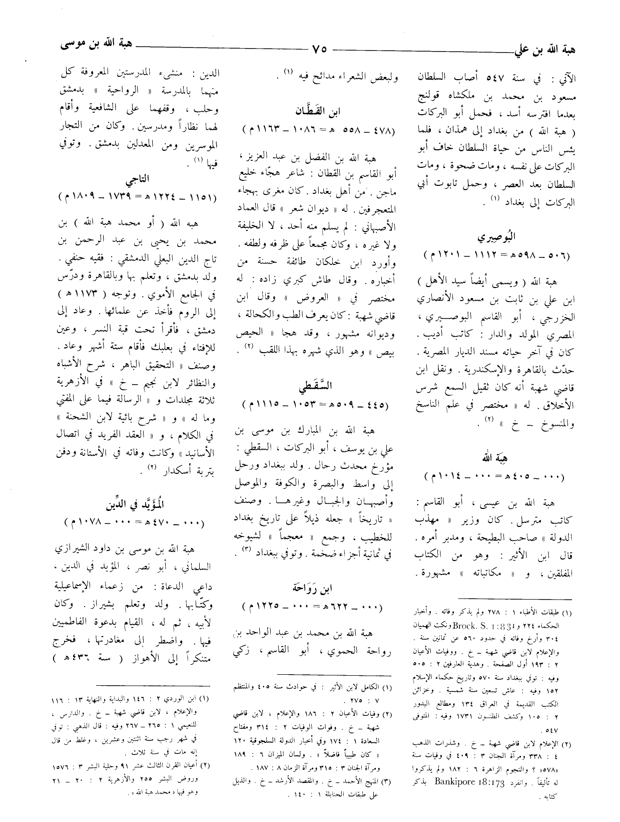 (2) وفيات الأعيان 2: 186 والإعلام، لابن قاضي شهبة - خ. وفوات الوفيات 2: 314 ومفتاح السعادة 1: 174 وفي أخبار الدولة السلجوقية 120 " كان طبيبا فاضلا ". ولسان الميزان 6: 189 ومرآة الجنان 3: 315 ومرآة الزمان 8: 187.