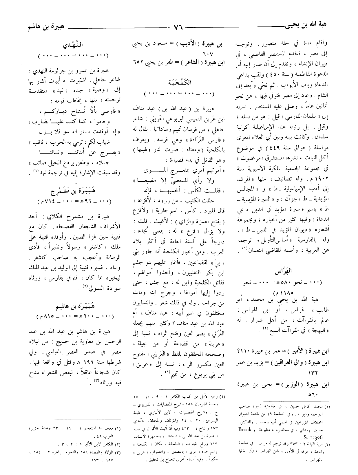 (1) رغبة الآمل من كتاب الكامل 1: 9 - 10، 17 وحلية الفرسان 155 وشرح المفضليات، للتبريزي - خ. وشرح المفضليات، لابن الأنباري، طبعة اليسوعيين 20، 24 والمؤتلف والمختلف للآمدي 173 والتاج 1: 463 وفيه أن أثبت الأقوال في نسبه " هُبَيْرَة بن عبد الله بن عبد مناف " وجمهرة الأنساب 213 ووقع لقبه فيه " الطحلبة " مكان " الكلحبة " واسم جده " عزيز " بالتصغير، والصواب " عرين " مكبرا، وفيه أسماء أخرى تحتاج إلى تحقيق.