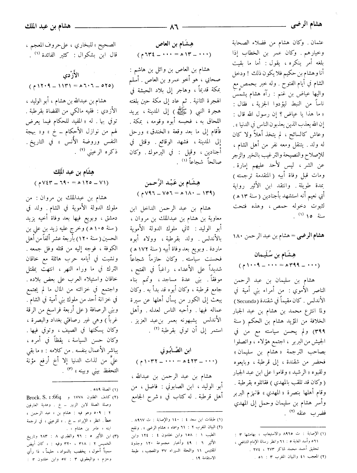 (2) البيان المغرب 2: 61 وسماه " هشام الرضى ". ونفح الطيب 1: 158 وابن خلدون 4: 124 وابن الأثير 6: 49 وأخبار مجموعة 120 وجذوة المقتبس 11 والحلة السيراء 37 والمعجب، طبعة الاستقامة 19.