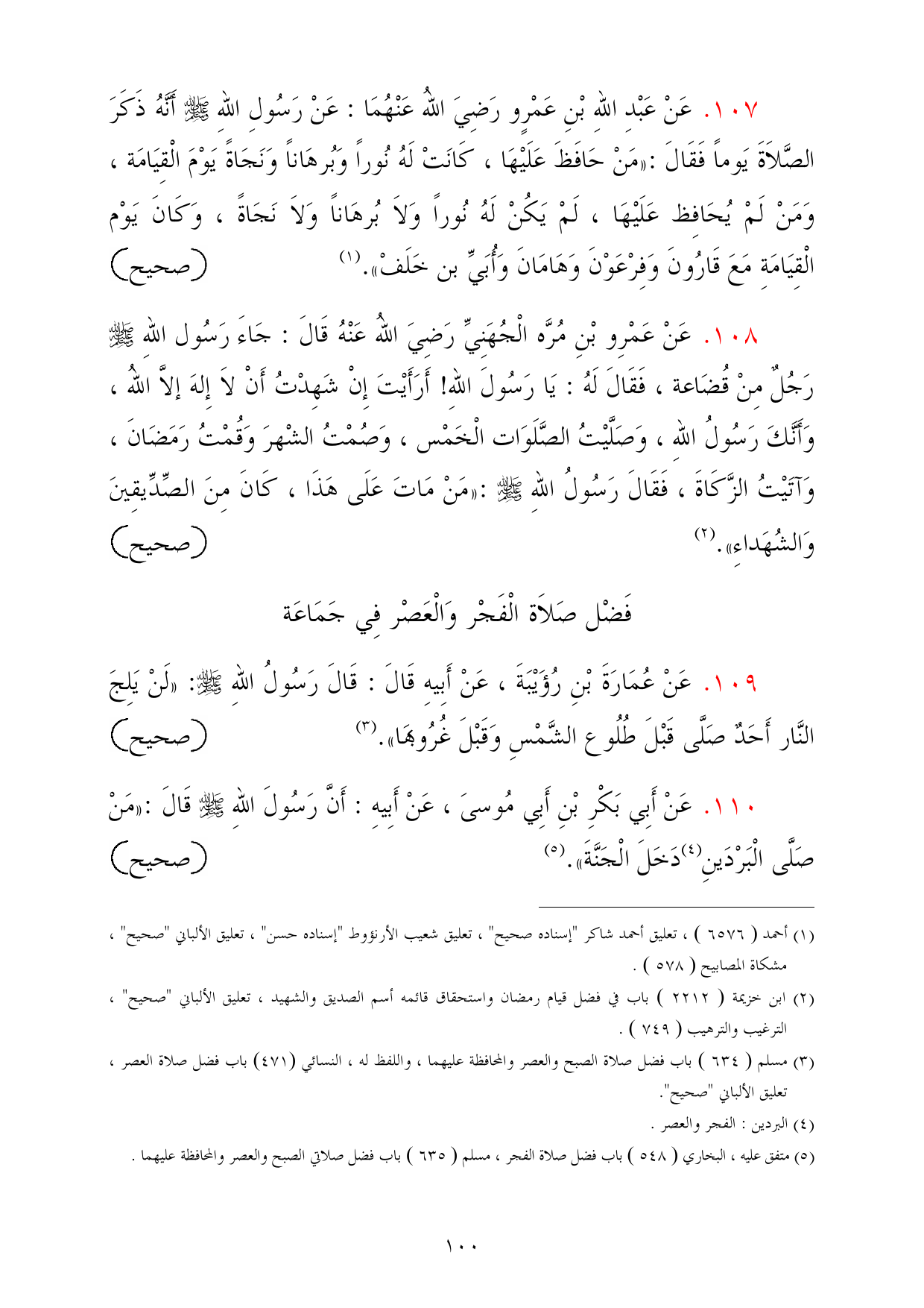 107 - عَنْ عَبْدِ اللهِ بْنِ عَمْرٍو رَضِيَ اللهُ عَنْهُمَا: عَنْ رَسُولِ اللهِ - صلى الله عليه وسلم - أَنَّهُ ذَكَرَ الصَّلاَةَ يَوماً فَقَالَ: «مَنْ حَافَظَ عَلَيْهَا، كَانَتْ لَهُ نُوراً وَبُرهَاناً وَنَجَاةً يَوْمَ الْقِيَامَة، وَمَنْ لَمْ يُحَافِظ عَلَيْهَا، لَمْ يَكُنْ لَهُ نُوراً وَلاَ بُرهَاناً وَلاَ نَجَاةً، وَكَانَ يَوْم الْقِيَامَةِ مَعَ قَارُونَ وَفِرْعَوْنَ وَهَامَانَ وَأُبَيِّ بن خَلَفْ». (¬1) =صحيح