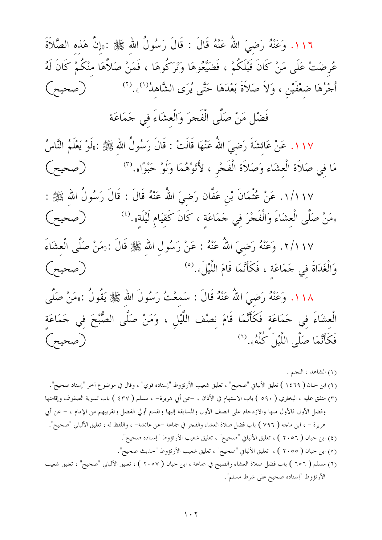 117/ 1. عَنْ عُثْمَانَ بْنِ عَفَّان رَضِيَ اللهُ عَنْهُ قَالَ: قَالَ رَسُولُ اللهِ - صلى الله عليه وسلم -: «مَنْ صَلَّى الْعِشَاءَ وَالْفَجْرَ فِي جَمَاعَةٍ، كَانَ كَقِيَامِ لَيْلَةٍ». (¬4) =صحيح