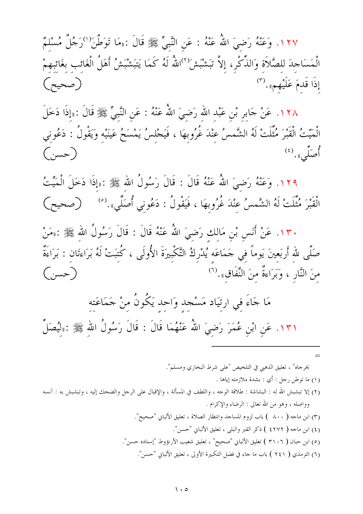 127 - وَعَنْهُ رَضِيَ اللهُ عَنْهُ: عَنِ النَّبِيِّ - صلى الله عليه وسلم - قَالَ: «مَا تَوَطَّنَ (¬1) رَجُلٌ مُسْلِمٌ الْمَسَاجِدَ للِصَّلاَةِ وَالذِّكْرِ، إِلاَّ تبَشْبَشَ (¬2) اللهُ لَهُ كَمَا يَتبَشْبَشُ أَهَلُ الْغَائِبِ بِغَائِبِهِمْ إِذَا قَدِمَ عَلَيْهِم». (¬3) =صحيح