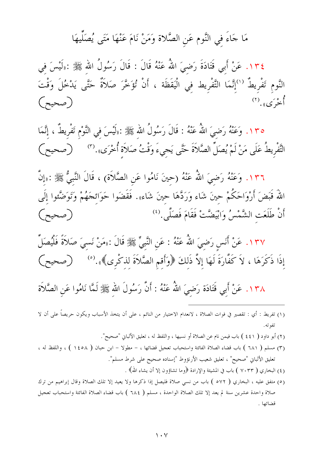 137 - عَنْ أَنَسٍ رَضِيَ اللهُ عَنْهُ: عَنِ النَّبِيِّ - صلى الله عليه وسلم - قَالَ: «مَنْ نَسِيَ صَلاَةً فَلْيُصَلِّ إِذَا ذَكَرَهَا، لاَ كَفَّارَةَ لَهَا إِلاَّ ذَلِكَ {وَأَقِمِ الصَّلاَةَ لِذِكْرِى}». (¬5) =صحيح