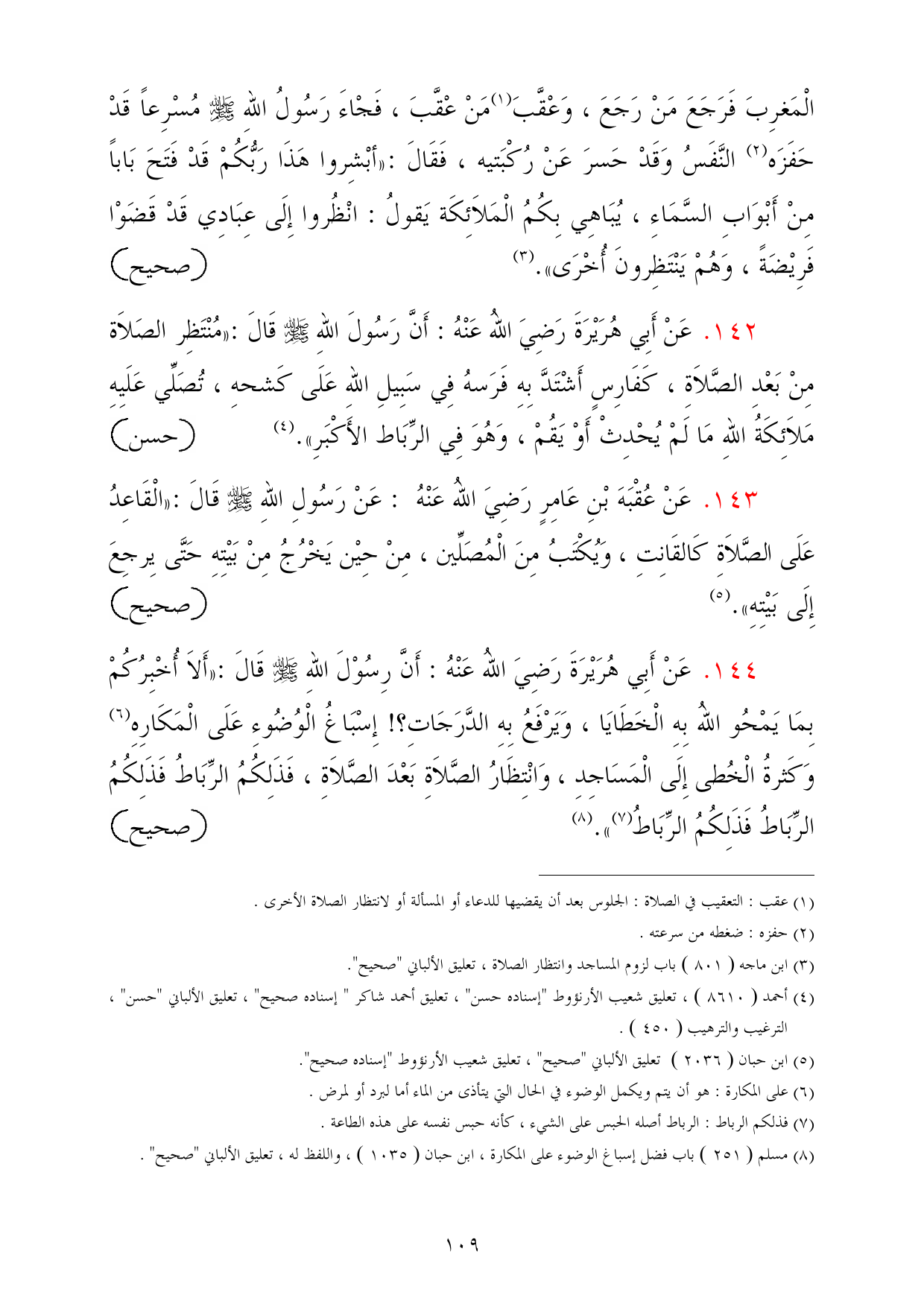 143 - عَنْ عُقْبَهَ بْنِ عَامِرٍ رَضِيَ اللهُ عَنْهُ: عَنْ رَسُولِ اللهِ - صلى الله عليه وسلم - قَالَ: «الْقَاعِدُ عَلَى الصَّلاَةِ كَالقَانِتِ، وَيُكْتَبُ مِنَ الْمُصَلِّين، مِنْ حِيْن يَخْرُجُ مِنْ بَيْتِهِ حَتَّى يِرجِعَ إِلَى بَيْتِهِ». (¬5) =صحيح