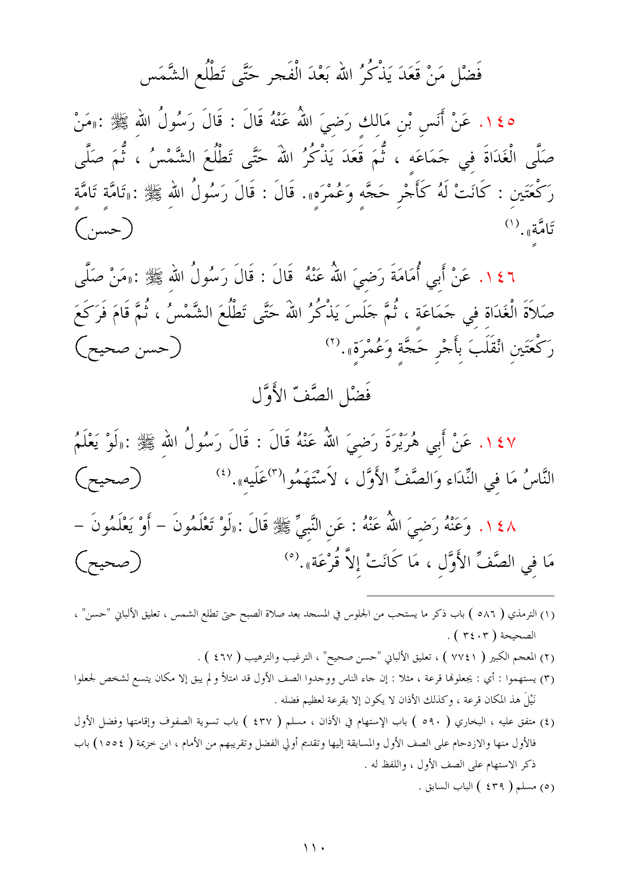 146 - عَنْ أَبِي أُمَامَةَ رَضِيَ اللهُ عَنْهُ قَالَ: قَالَ رَسُولُ اللهِ - صلى الله عليه وسلم -: «مَنْ صَلَّى صَلاَةَ الْغَدَاةِ فِي جَمَاعَةٍ، ثُمَّ جَلَسَ يَذْكُرُ اللهَ حَتَّى تَطْلُعَ الشَّمْسُ، ثُمَّ قَامَ فَرَكَعَ رَكْعَتَينِ انْقَلَبَ بِأَجْرِ حَجَّةٍ وَعُمْرَةٍ». (¬2) =حسن صحيح