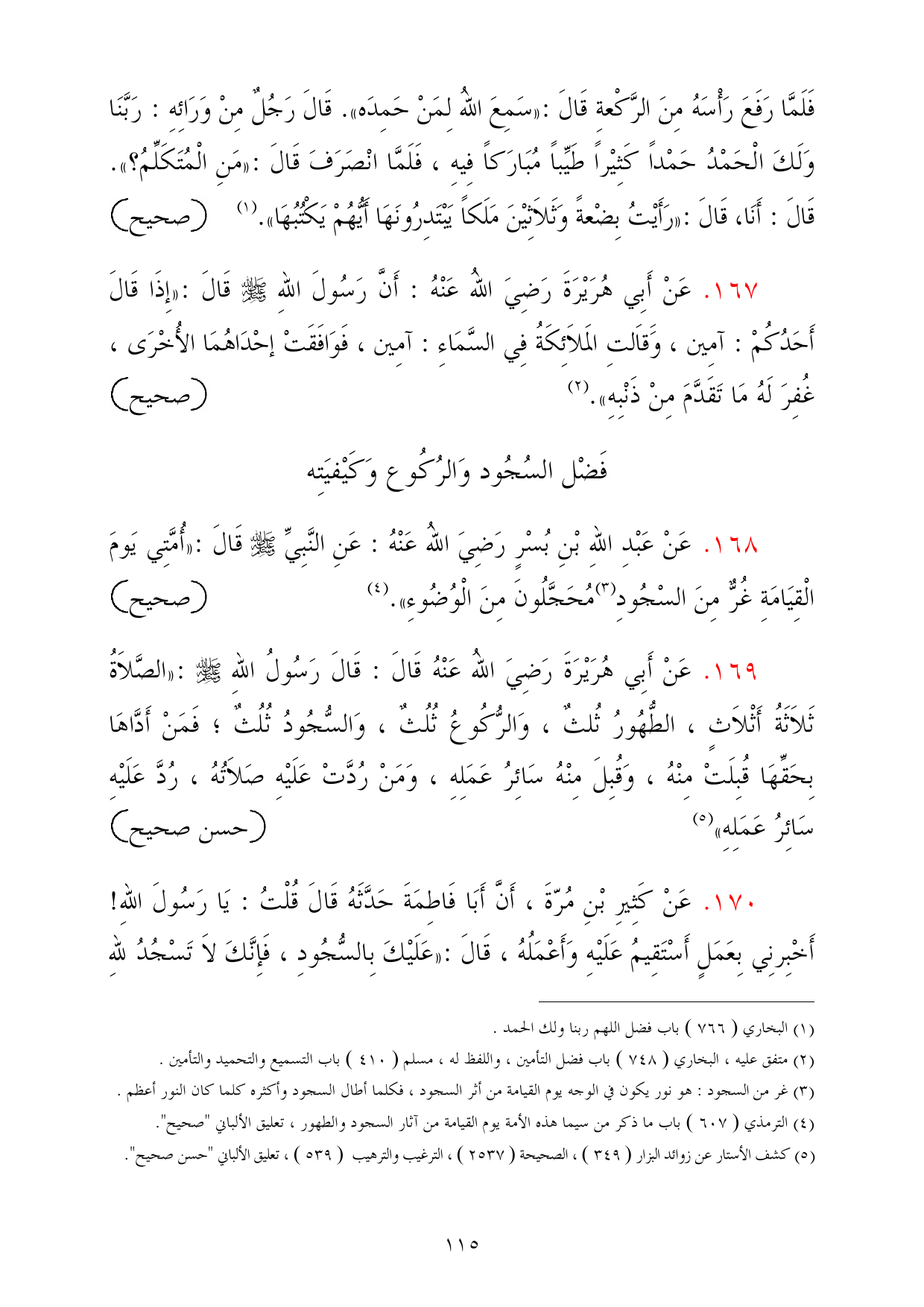 169 - عَنْ أَبِي هُرَيْرَةَ رَضِيَ اللهُ عَنْهُ قَالَ: قَالَ رَسُولُ اللهِ - صلى الله عليه وسلم -: «الصَّلاَةُ ثَلاَثَةُ أَثْلاَثٍ، الطُّهُورُ ثُلثٌ، وَالرُّكُوعُ ثُلُثٌ، وَالسُّجُودُ ثُلُثٌ؛ فَمَنْ أَدَّاهَا بِحَقِّهَا قُبِلَتْ مِنْهُ، وَقُبِلَ مِنْهُ سَائِرُ عَمَلِهِ، وَمَنْ رُدَّتْ عَلَيْهِ صَلاَتُهُ، رُدَّ عَلَيْهِ سَائِرُ عَمَلِهِ» (¬5) =حسن صحيح