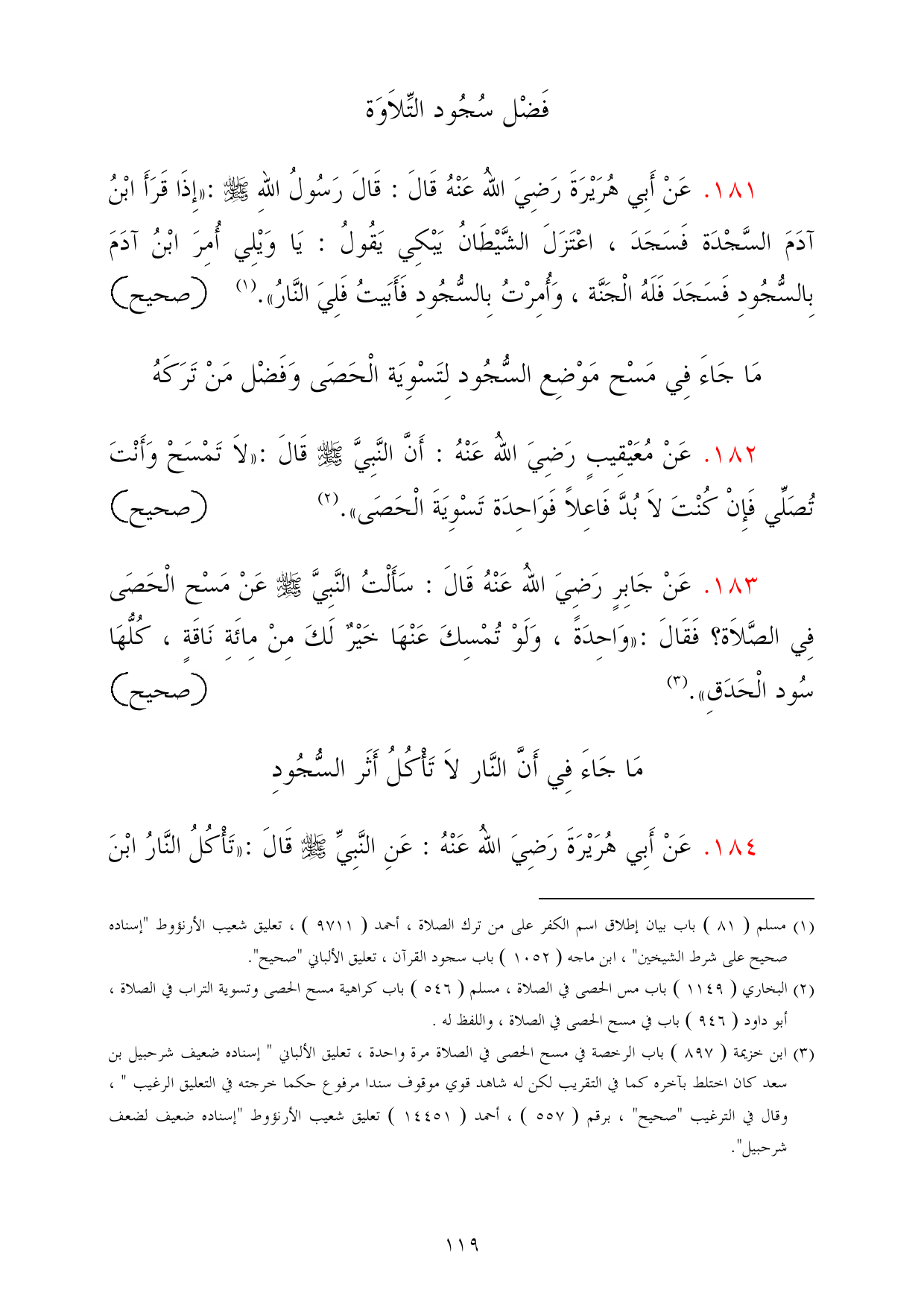 183 - عَنْ جَابِرٍ رَضِيَ اللهُ عَنْهُ قَالَ: سَأَلْتُ النَّبِيَّ - صلى الله عليه وسلم - عَنْ مَسْح الْحَصَى فِي الصَّلاَة؟ فَقَالَ: «وَاحِدَةً، وَلَوْ تُمْسِكَ عَنْهَا خَيْرٌ لَكَ مِنْ مِائَةِ نَاقَةٍ، كُلُّهَا سُود الْحَدَقِ». (¬3) =صحيح