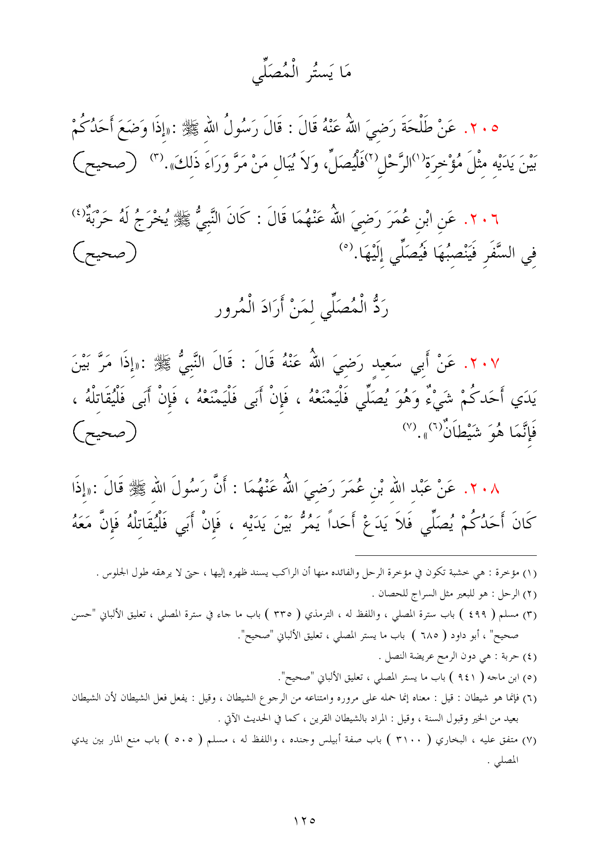 208 - عَنْ عَبْدِ اللهِ بْنِ عُمَرَ رَضِيَ اللهُ عَنْهُمَا: أَنَّ رَسُولَ اللهِ - صلى الله عليه وسلم - قَالَ: «إِذَا كَانَ أَحَدُكُمْ يُصَلِّي فَلاَ يَدَعْ أَحَداً يَمُرُّ بَيْنَ يَدَيْهِ، فَإِنْ أَبَي فَلْيُقَاتِلْهُ فَإِنَّ مَعَهُ