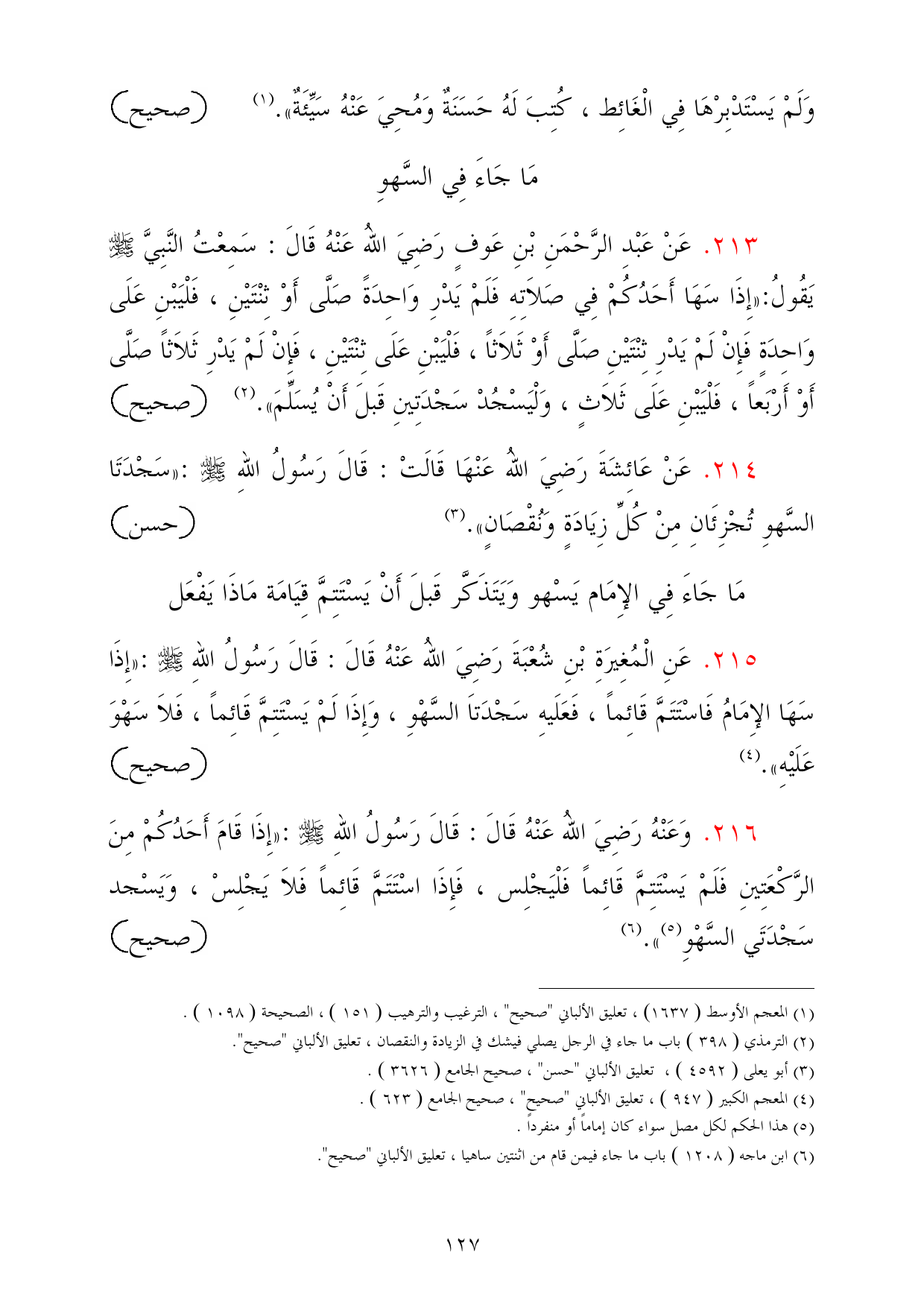 216 - وَعَنْهُ رَضِيَ اللهُ عَنْهُ قَالَ: قَالَ رَسُولُ اللهِ - صلى الله عليه وسلم -: «إِذَا قَامَ أَحَدُكُمْ مِنَ الرَّكْعَتِينِ فَلَمْ يَسْتَتِمَّ قَائِماً فَلْيَجْلِس، فَإِذَا اسْتَتَمَّ قَائِماً فَلاَ يَجْلِسْ، وَيَسْجد سَجْدَتَي السَّهْوِ (¬5)». (¬6) =صحيح