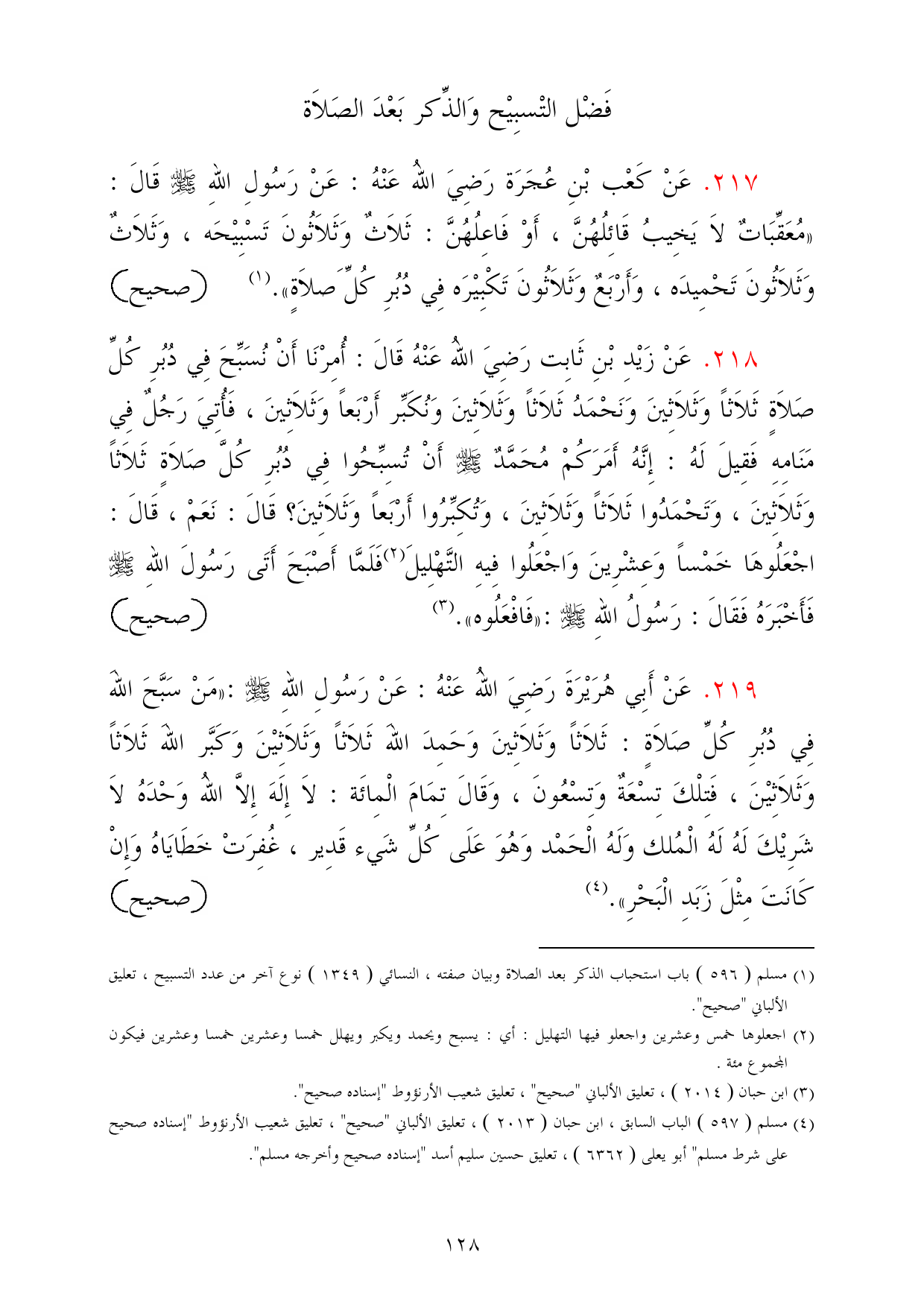 217 - عَنْ كَعْب بْنِ عُجَرَة رَضِيَ اللهُ عَنْهُ: عَنْ رَسُولِ اللهِ - صلى الله عليه وسلم - قَالَ: «مُعَقِّبَاتٌ لاَ يَخِيبُ قَائِلُهُنَّ، أَوْ فَاعِلُهُنَّ: ثَلاَثٌ وَثَلاَثُونَ تَسْبِيْحَه، وَثَلاَثٌ وَثَلاَثُونَ تَحْمِيدَه، وَأَرْبَعٌ وَثَلاَثُونَ تَكْبِيْرَه فِي دُبُرِ كُلِّ َصلاَةٍ». (¬1) =صحيح