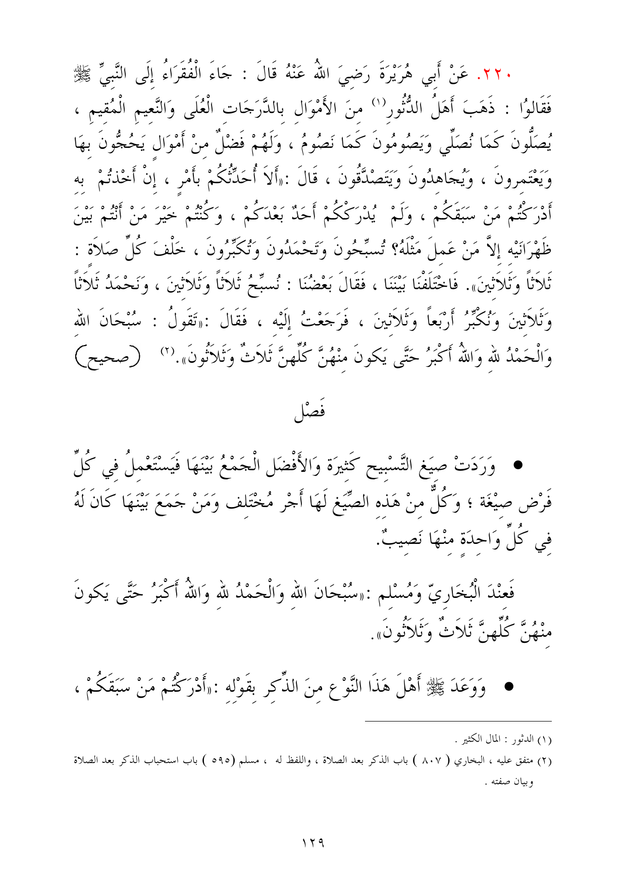 220 - عَنْ أَبِي هُرَيْرَةَ رَضِيَ اللهُ عَنْهُ قَالَ: جَاءَ الْفُقَرَاءُ إِلَى النَّبِيِّ - صلى الله عليه وسلم - فَقَالوُا: ذَهَبَ أَهَلُ الدُّثُورِ (¬1) مِنَ الأَمْوَالِ بِالدَّرَجَاتِ الْعُلَى وَالنَّعِيمِ الْمُقِيمِ، يُصَلُّونَ كَمَا نُصَلِّي وَيَصُومُونَ كَمَا نَصُومُ، وَلَهُمْ فَضْلٌ مِنْ أَمْوَالٍ يَحُجُّونَ بِهَا وَيَعْتَمِرونَ، وَيُجَاهِدُونَ وَيَتَصْدَّقُونَ، قَالَ: «أَلاَ أُحَدِّثُكُمْ بأَمْرٍ، إِنْ أَخْذتُمْ بِهِ أَدْرَكْتُمْ مَنْ سَبَقَكُمْ، وَلَمْ يُدْرَكْكُمْ أَحَدٌ بَعْدَكُمْ، وَكُنْتُمْ خَيْرَ مَنْ أَنْتُمْ بَيْنَ ظَهْرَانَيْهِ إِلاَّ مَنْ عَمِلَ مَثْلَهُ؟ تُسبِّحُونَ وَتَحْمَدُونَ وَتُكَبِّرُونَ، خَلْفَ كُلِّ صَلاَةٍ: ثَلاَثاً وَثَلاَثِينَ». فَاخْتَلَفْنَا بَيْنَنَا، فَقَالَ بَعْضُنَا: نُسبِّحُ ثَلاَثاً وَثَلاَثِينَ، وَنَحْمَدُ ثَلاَثاً وَثَلاَثِينَ وَنُكْبِّرُ أَرْبَعاً وَثَلاَثِينَ، فَرَجَعْتُ إِلَيْهِ، فَقَالَ: «تَقَولُ: سُبْحَانَ اللهِ وَالْحَمْدُ للهِ وَاللهُ أَكْبَرُ حَتَّى يَكونَ مِنْهُنَّ كُلِّهنَّ ثَلاَثٌ وَثَلاَثُونَ». (¬2) =صحيح
