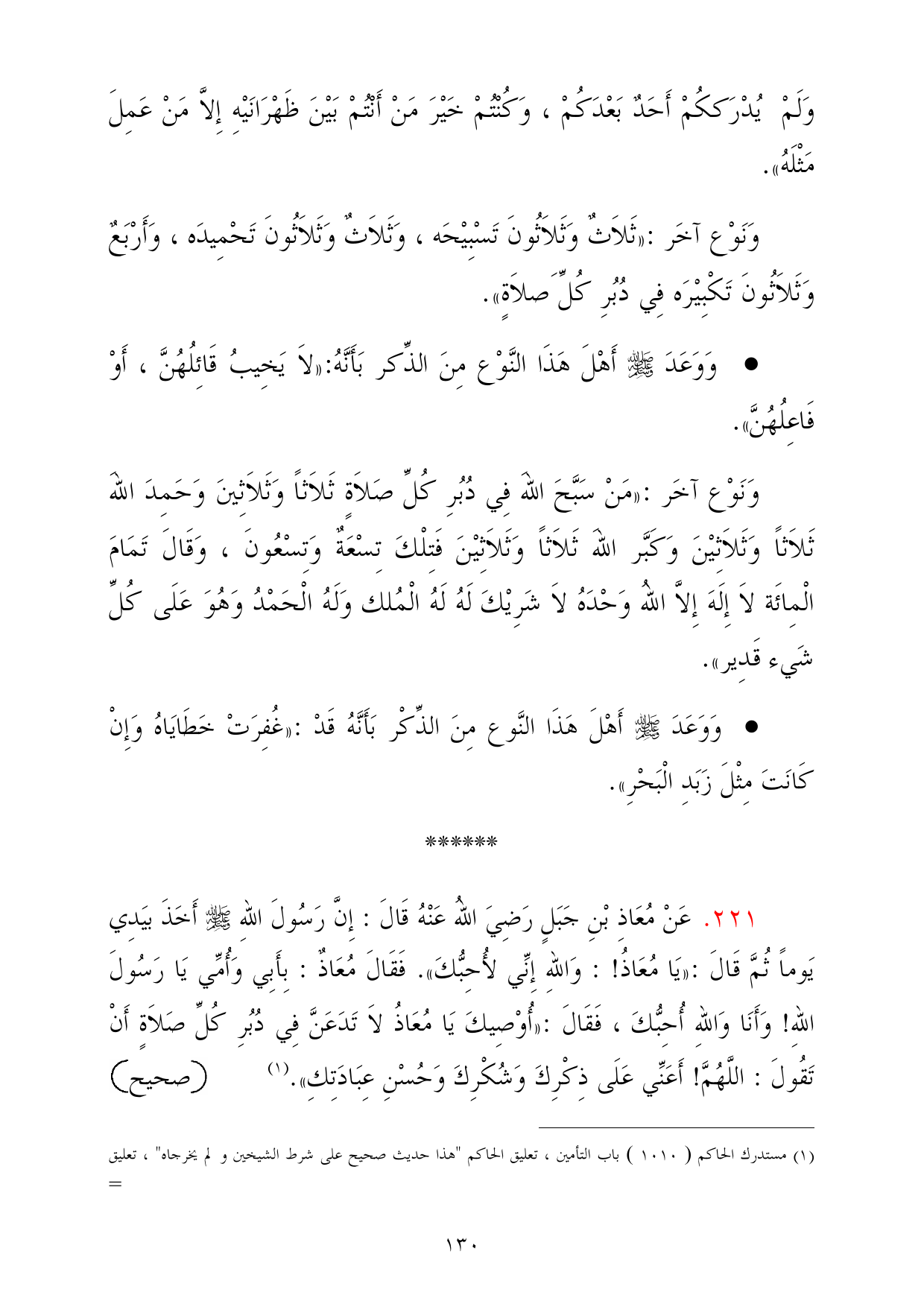 221 - عَنْ مُعَاذِ بْنِ جَبَلٍ رَضِيَ اللهُ عَنْهُ قَالَ: إِنَّ رَسُولَ اللهِ - صلى الله عليه وسلم - أَخَذَ بيَدِي يَوماً ثُمَّ قَالَ: «يَا مُعَاذُ!: وَاللهِ إِنِّي لأُحِبُّكَ». فَقَالَ مُعَاذٌ: بِأَبِي وَأُمِّي يَا رَسُولَ اللهِ! وَأَنَا وَاللهِ أُحِبُّكَ، فَقَالَ: «أُوْصِيكَ يَا مُعَاذُ لاَ تَدَعَنَّ فِي دُبُرِ كُلِّ صَلاَةٍ أَنْ تَقُولَ: اللَّهُمَّ! أَعَنِّي عَلَى ذِكْرِكَ وَشُكْرِكَ وَحُسْنِ عِبَادَتِكِ». (¬1) =صحيح