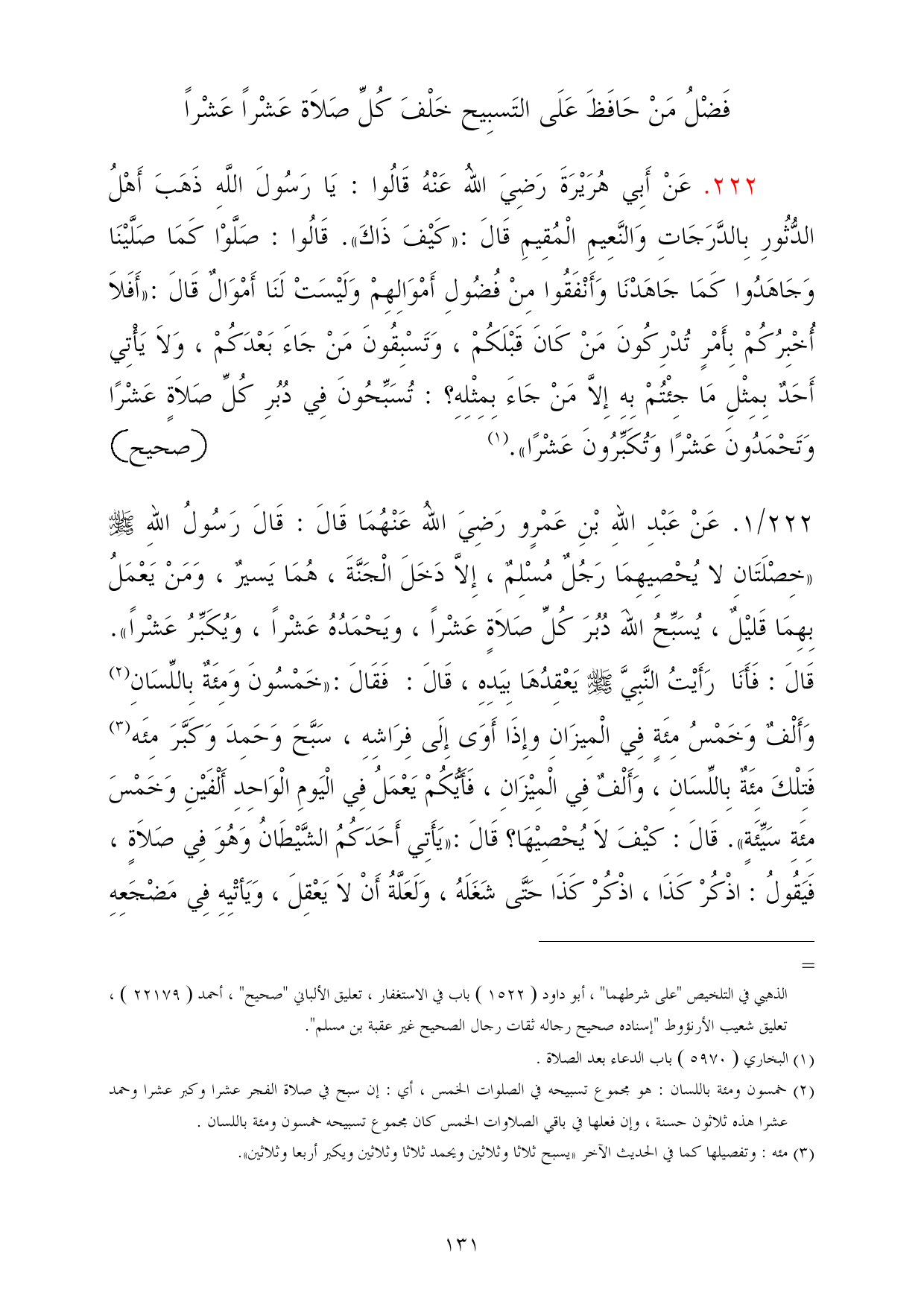 222/ 1. عَنْ عَبْدِ اللهِ بْنِ عَمْرٍو رَضِيَ اللهُ عَنْهُمَا قَالَ: قَالَ رَسُولُ اللهِ - صلى الله عليه وسلم - «خِصْلَتَانِ لا يُحْصِيهِمَا رَجُلٌ مُسْلِمٌ، إِلاَّ دَخَلَ الْجَنَّةَ، هُمَا يَسيرٌ، وَمَنْ يَعْمَلُ بِهِمَا قَليْلٌ، يُسَبِّحُ اللهَ دُبُرَ كُلِّ صَلاَةٍ عَشْراً، ويَحْمَدُهُ عَشْراً، وَيُكَبِّرُ عَشْراً». قَالَ: فَأَنَا رَأَيْتُ النَّبِيَّ - صلى الله عليه وسلم - يَعْقِدُهَا بِيَدِهِ، قَالَ: فَقَالَ: «خَمْسُونَ وَمِئَةٌ بِاللِّسَانِ (¬2) وَأَلْفٌ وَخَمْسُ مِئَةٍ فِي الْمِيزَانِ وإِذَا أَوَى إِلَى فِرَاشِهِ، سَبَّحَ وَحَمِدَ وَكَبَّرَ مِئَه (¬3) فَتِلْكَ مِئَةٌ بِاللِّسَانِ، وَأَلْفٌ فِي الْمِيْزَانِ، فَأَيُّكُمْ يَعْمَلُ فِي الْيَومِ الْوَاحِدِ أَلْفَيْنِ وَخَمْسَ مِئَةِ سَيِّئَةٍ». قَالَ: كيْفَ لاَ يُحْصِيْهَا؟ قَالَ: «يَأَتِي أَحَدَكُمُ الشَّيْطَانُ وَهُوَ فِي صَلاَةٍ، فَيَقُولُ: اذْكُرْ كَذَا، اذْكُرْ كَذَا حَتَّى شَغَلَهُ، وَلَعَلَّةُ أَنْ لاَ يَعْقِلَ، وَيَأتْيِهِ فِي مَضْجَعِهِ