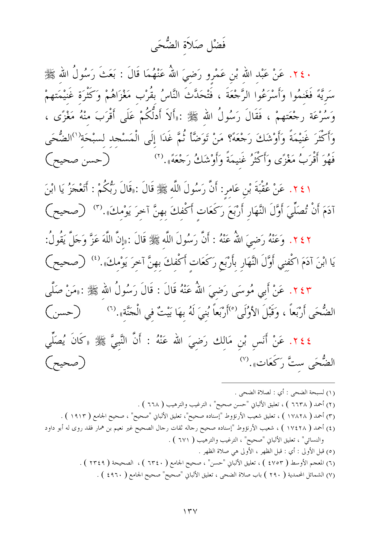 240 - عَنْ عَبْدِ اللهِ بْنِ عَمْرٍو رَضِيَ اللهُ عَنْهُمَا قَالَ: بَعَثَ رَسُولُ اللهِ - صلى الله عليه وسلم - سَرِيَّهً فَغَنِمُوا وَأَسْرَعُوا الرَّجْعَةَ، فَتْحَدَّثَ النَّاسُ بِقُرْبِ مَغْزَاهُمْ وَكَثْرَةِ غَنِيْمَتهمْ وَسُرْعَة رجْعَتهمْ، فَقَالَ رَسُولُ اللهِ - صلى الله عليه وسلم -: «أَلاَ أَدلُّكُمْ عَلَى أَقْرَبَ مِنْهُ مَغْزًى، وَأَكْثَرَ غَنِيْمَةً وَأَوْشَكَ رَجْعَهً؟ مَنْ تَوَضَّأ ثُمَّ غَدَا إِلَى الْمَسْجِدِ لِسبْحَةِ (¬1) الضُّحَى فَهُوَ أَقْرَبُ مَغْزًى وَأَكْثَرُ غَنِيمَةً وَأَوْشَكُ رَجْعَهً». (¬2) =حسن صحيح