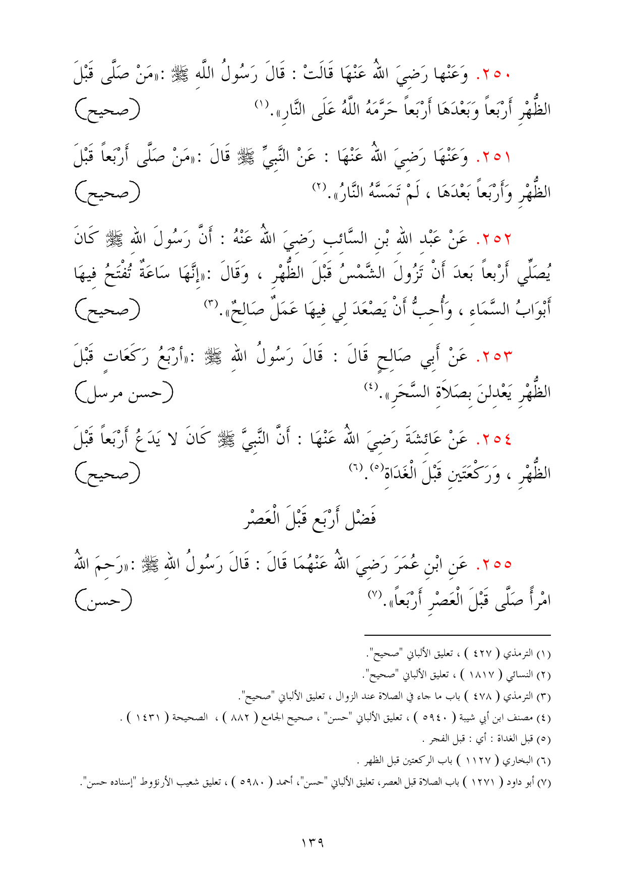 255 - عَنِ ابْنِ عُمَرَ رَضِيَ اللهُ عَنْهُمَا قَالَ: قَالَ رَسُولُ اللهِ - صلى الله عليه وسلم -: «رَحِمَ اللهُ امْرأً صَلَّى قَبْلَ الْعَصْرِ أَرْبَعاً». (¬7) =حسن