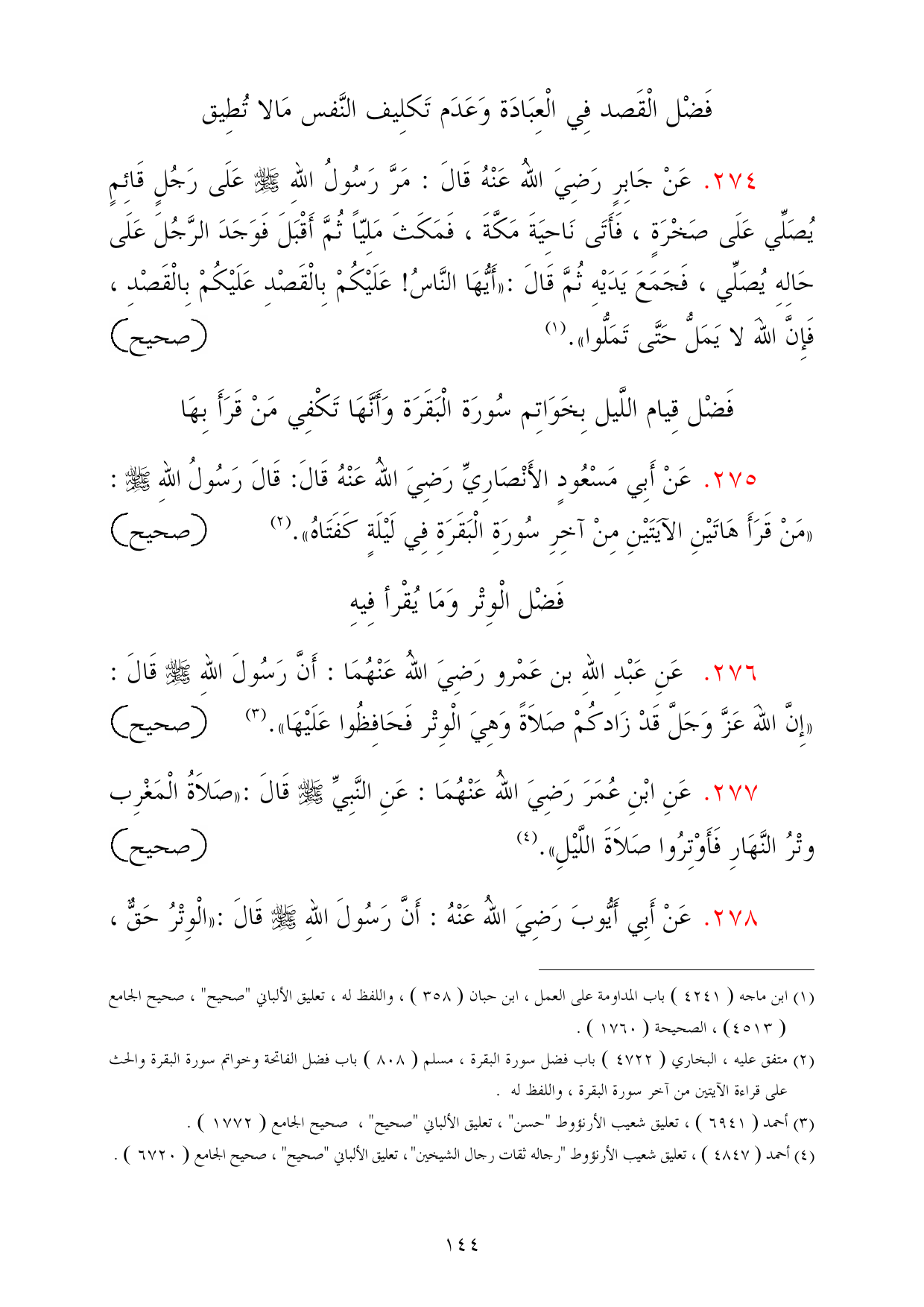 276 - عَنِ عَبْدِ اللهِ بن عَمْرو رَضِيَ اللهُ عَنْهُمَا: أَنَّ رَسُولَ اللهِ - صلى الله عليه وسلم - قَالَ: «إِنَّ اللهَ عَزَّ وَجَلَّ قَدْ زَادكُمْ صَلاَةً وَهِيَ الْوِتْر فَحَافِظُوا عَلَيْهَا». (¬3) =صحيح