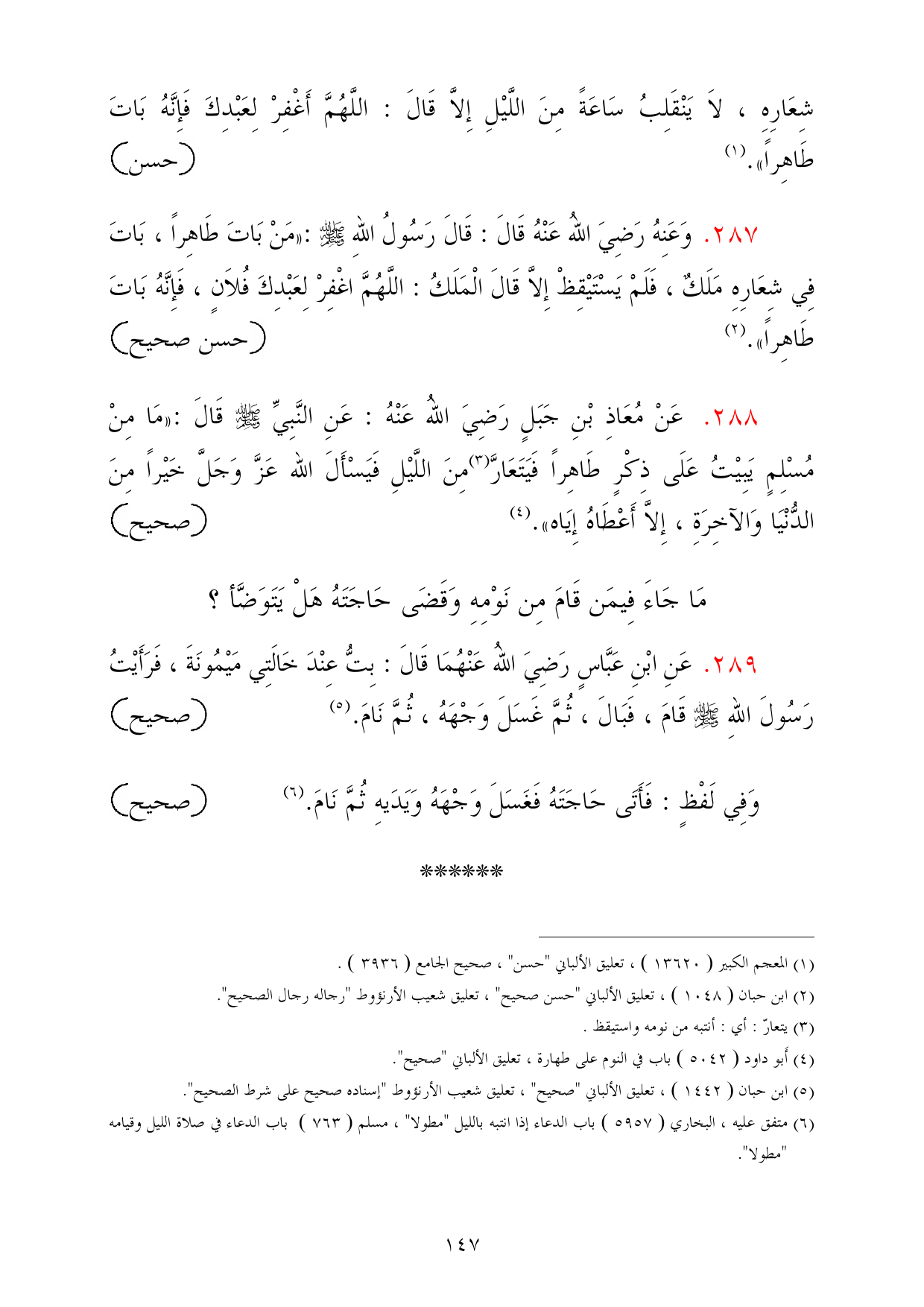 288 - عَنْ مُعَاذِ بْنِ جَبَلٍ رَضِيَ اللهُ عَنْهُ: عَنِ النَّبِيِّ - صلى الله عليه وسلم - قَالَ: «مَا مِنْ مُسْلِمٍ يَبِيْتُ عَلَى ذِكْرٍ طَاهِراً فَيَتَعَارَّ (¬3) مِنَ اللَّيْلِ فَيَسْأَلَ الله عَزَّ وَجَلَّ خَيْراً مِنَ الدُّنْيَا وَالآخِرَةِ، إِلاَّ أَعْطَاهُ إِيَاه». (¬4) =صحيح
