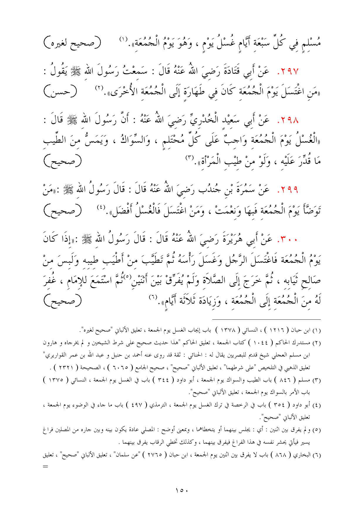 298 - عَنْ أَبِي سَعِيْدٍ الْخُدْرِيِّ رَضِيَ اللهُ عَنْهُ: أَنَّ رَسُولَ اللهِ - صلى الله عليه وسلم - قَالَ: «الْغُسْلُ يَوْمَ الْجُمُعَةِ وَاجِبٌ عَلَى كُلِّ مُحْتَلِمٍ، وَالسِّوَاكُ، وَيَمَسُّ مِنَ الطِّيبِ مَا قُدِّرَ عَلَيْهِ، وَلَوْ مِنْ طِيْبِ الْمَرْأةِ». (¬3) =صحيح