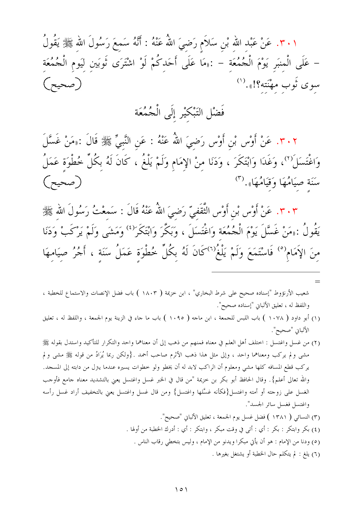 303 - عَنْ أَوْس بْنِ أَوْس الثَّقَفِيّ رَضِيَ اللهُ عَنْهُ قَالَ: سَمِعْتُ رَسُولَ اللهِ - صلى الله عليه وسلم - يَقُولُ: «مَنْ غَسَّلَ يَوْمَ الْجُمُعَةِ وَاغْتَسَلَ، وَبَكَّرَ وَابْتَكَرَ (¬4) وَمَشَى وَلَمْ يَرْكَبْ وَدَنَا مِنَ الإَمَامِ (¬5) فَاسْتَمَعَ وَلَمْ يَلْغُ (¬6) كَانَ لَهُ بِكُلِّ خُطْوَةٍ عَمَلُ سَنَةٍ، أَجُرُ صِيَامِهَا