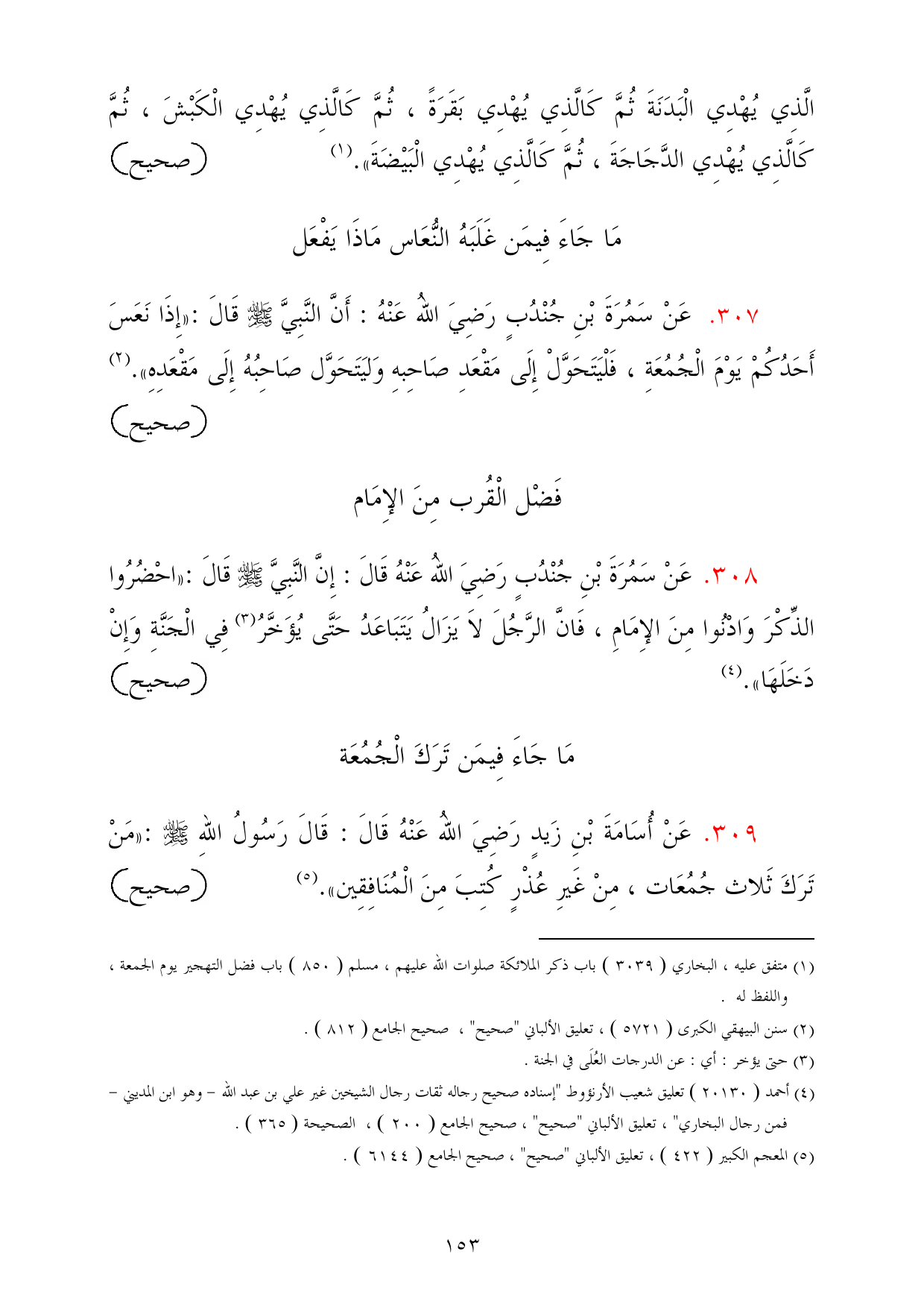 309 - عَنْ أُسَامَةَ بْنِ زَيدٍ رَضِيَ اللهُ عَنْهُ قَالَ: قَالَ رَسُولُ اللهِ - صلى الله عليه وسلم -: «مَنْ تَرَكَ ثَلاث جُمُعَات، مِنْ غَيرِ عُذْرٍ كُتِبَ مِنَ الْمُنَافِقِين». (¬5) =صحيح