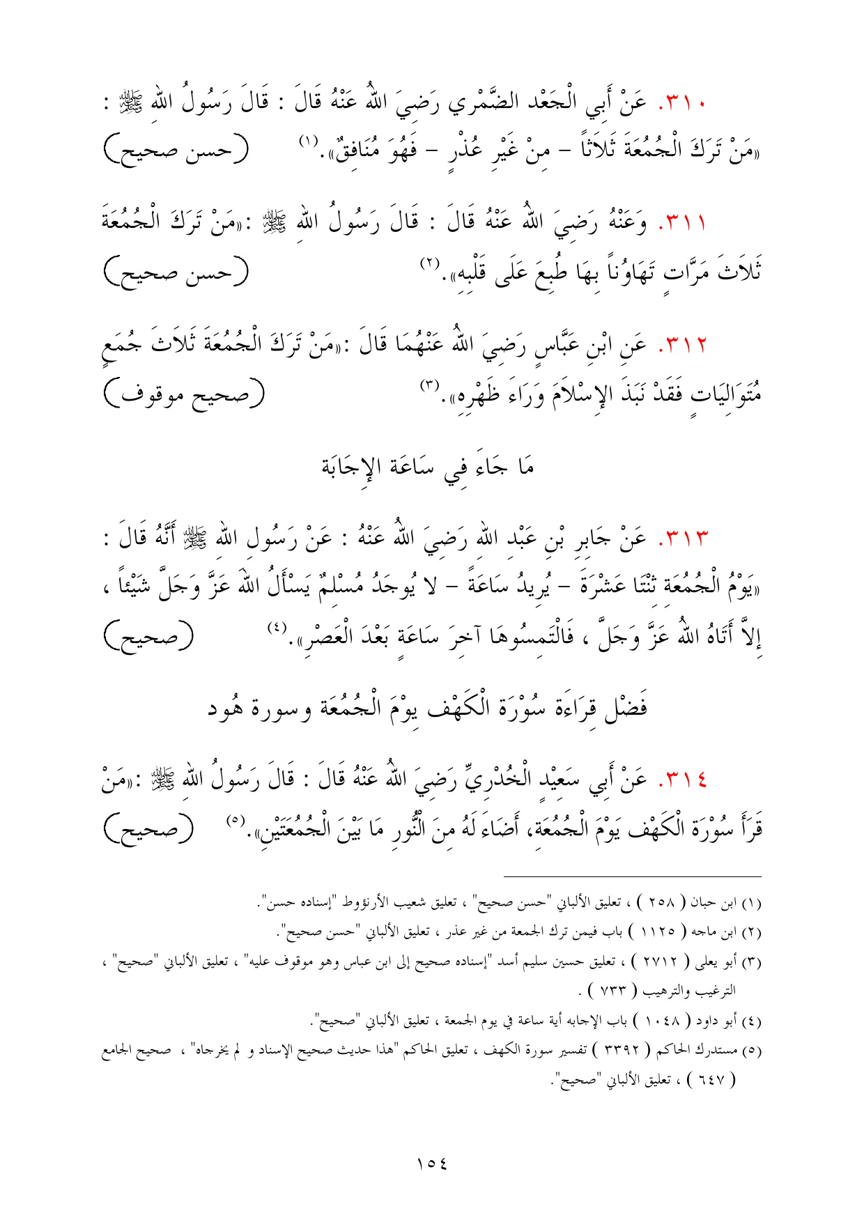 314 - عَنْ أَبِي سَعِيْدٍ الْخُدْرِيِّ رَضِيَ اللهُ عَنْهُ قَالَ: قَالَ رَسُولُ اللهِ - صلى الله عليه وسلم -: «مَنْ قَرَأَ سُوْرَة الْكَهْف يَوْمَ الْجُمُعَةِ، أَضَاءَ لَهُ مِنَ الْنُّورِ مَا بَيْنَ الْجُمُعَتَيْنِ». (¬5) =صحيح