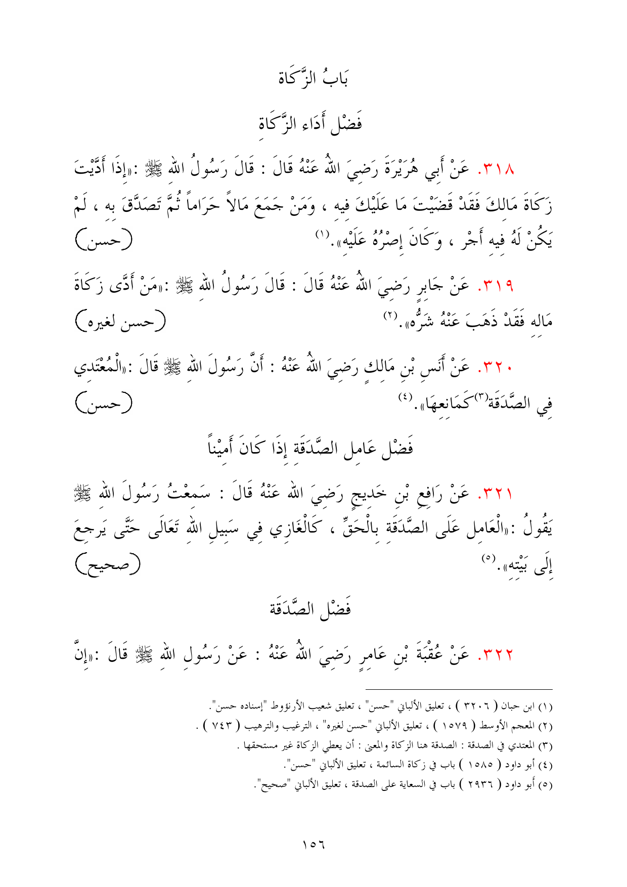 319 - عَنْ جَابِرٍ رَضِيَ اللهُ عَنْهُ قَالَ: قَالَ رَسُولُ اللهِ - صلى الله عليه وسلم -: «مَنْ أَدَّى زَكَاةَ مَالِهِ فَقَدْ ذَهَبَ عَنْهُ شَرُّه». (¬2) =حسن لغيره