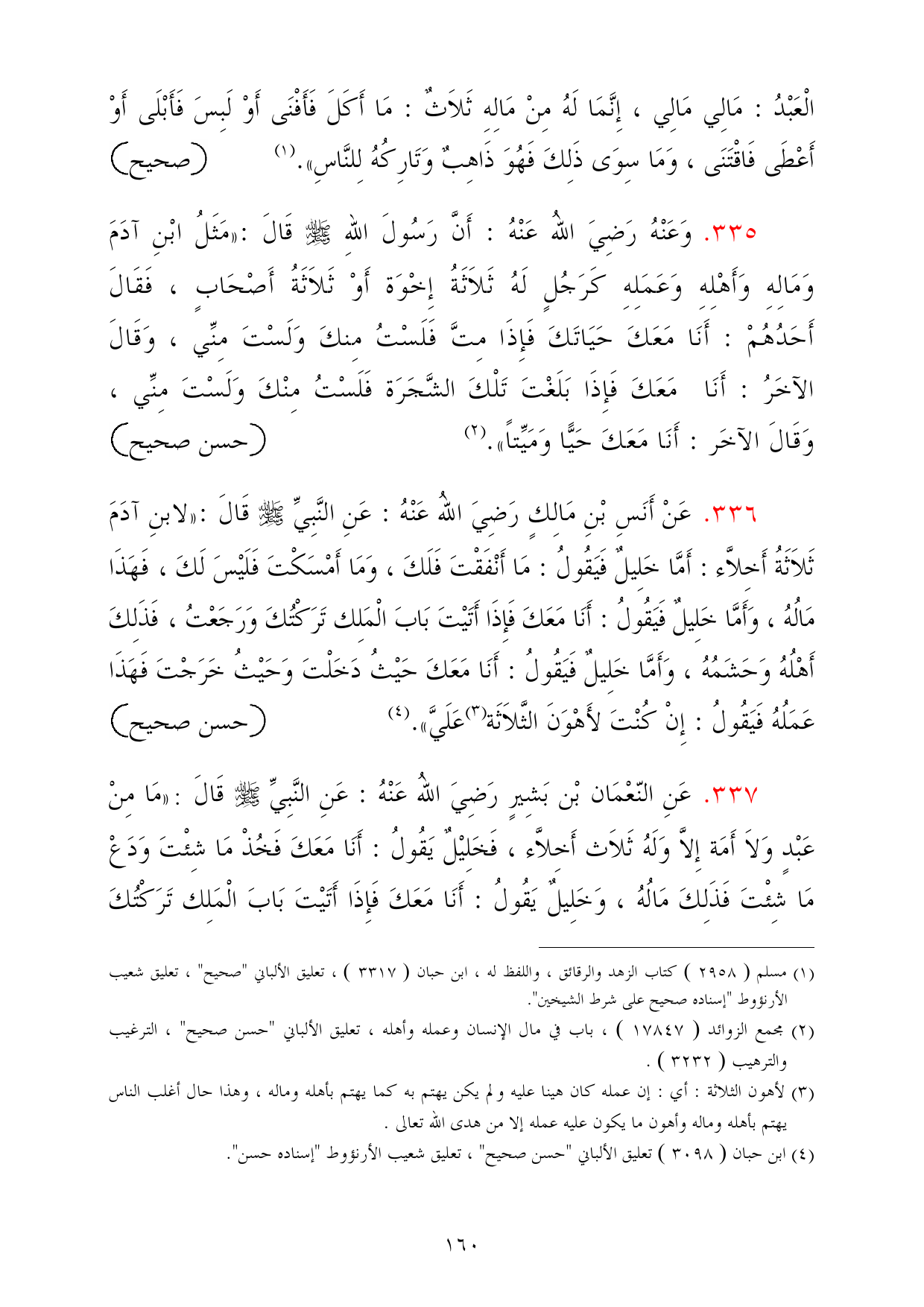 337 - عَنِ النّعْمَان بْن بَشِيرٍ رَضِيَ اللهُ عَنْهُ: عَنِ النَّبِيِّ - صلى الله عليه وسلم - قَالَ: «مَا مِنْ عَبْدٍ وَلاَ أَمَة إِلاَّ وَلَهُ ثَلاَث أَخِلاَّء، فَخَلِيْلٌ يَقُولُ: أَنَا مَعَكَ فَخُذْ مَا شِئْتَ وَدَعْ مَا شِئْتَ فَذَلِكَ مَالُهُ، وَخَلِيلٌ يَقُولُ: أَنَا مَعَكَ فَإِذَا أَتَيْتَ بَابَ الْمَلِك تَرَكْتُكَ