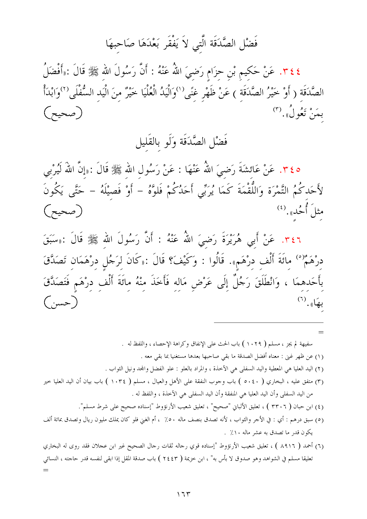 346 - عَنْ أَبِي هُرَيْرَةَ رَضِيَ اللهُ عَنْهُ: أَنَّ رَسُولَ اللهِ - صلى الله عليه وسلم - قَالَ: «سَبَقَ دِرْهَمٌ (¬5) مِائَةَ أَلْفِ دِرْهَمٍ». قَالُوا: وَكَيْفَ؟ قَالَ: «كَانَ لِرَجُلٍ دِرْهَمَانِ تَصَدَّقَ بِأَحَدِهِمَا، وَانْطَلَقَ رَجُلٌ إِلَى عَرْضِ مَالِهِ فَأَخَذَ مِنْهُ مِائَةَ أَلْفِ دِرْهَمٍ فَتَصَدَّقَ بِهَا». (¬6) =حسن