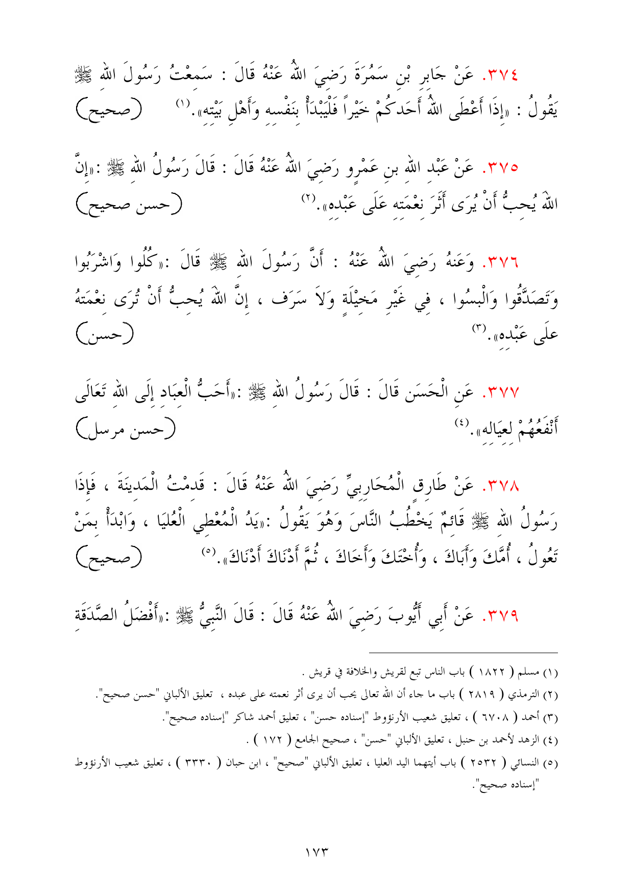 375 - عَنْ عَبْدِ اللهِ بنِ عَمْرٍو رَضِيَ اللهُ عَنْهُ قَالَ: قَالَ رَسُولُ اللهِ - صلى الله عليه وسلم -: «إِنَّ اللهَ يُحِبُّ أَنْ يُرَى أَثَرَ نِعْمَتِهِ عَلَى عَبْدِهِ». (¬2) =حسن صحيح