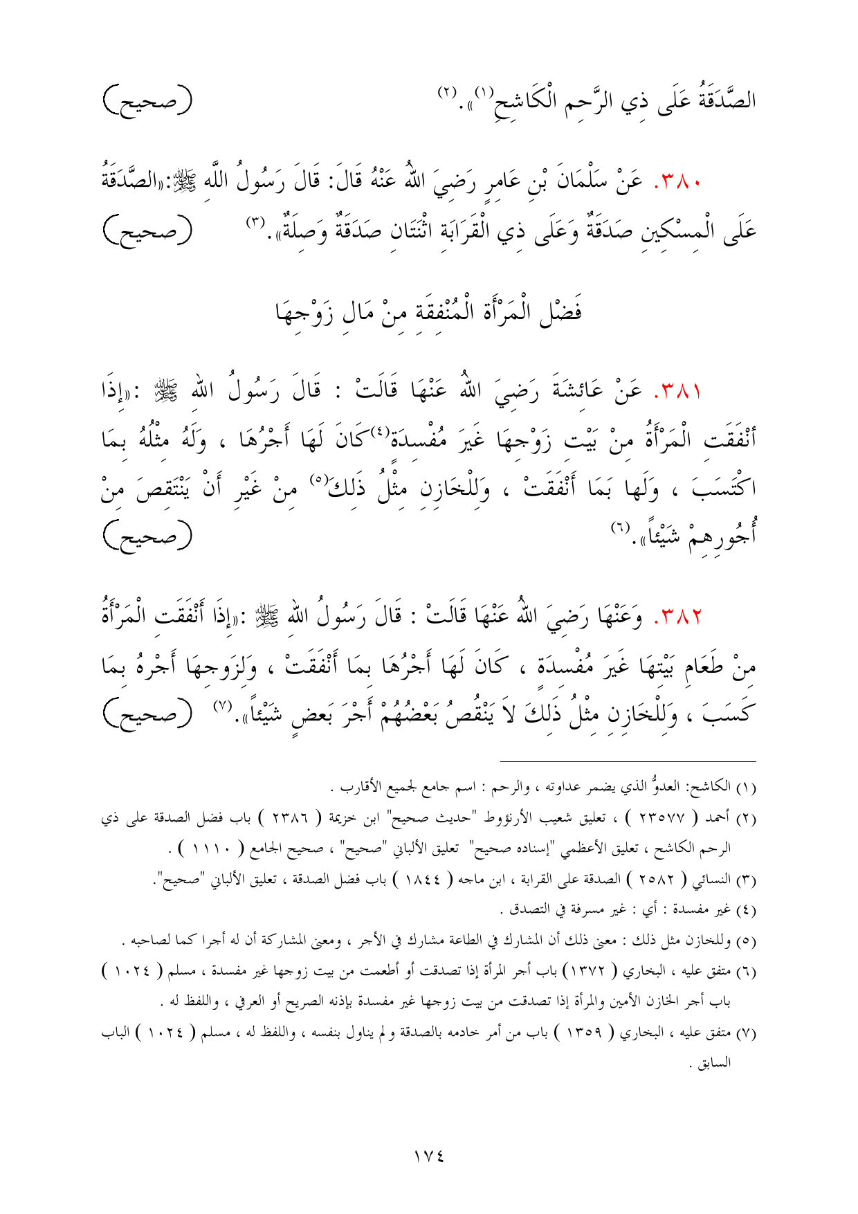 382 - وَعَنْهَا رَضِيَ اللهُ عَنْهَا قَالَتْ: قَالَ رَسُولُ اللهِ - صلى الله عليه وسلم -: «إِذَا أَنْفَقَتِ الْمَرْأَةُ مِنْ طَعَامِ بَيْتِهَا غَيرَ مُفْسِدَةٍ، كَانَ لَهَا أَجْرُهَا بِمَا أَنْفَقَتْ، وَلِزَوجِهَا أَجْرهُ بِمَا كَسَبَ، وَلِلْخَازِنِ مِثْلُ ذَلِكَ لاَ يَنْقُصُ بَعْضُهُمْ أَجْرَ بَعضٍ شَيْئاً». (¬7) =صحيح