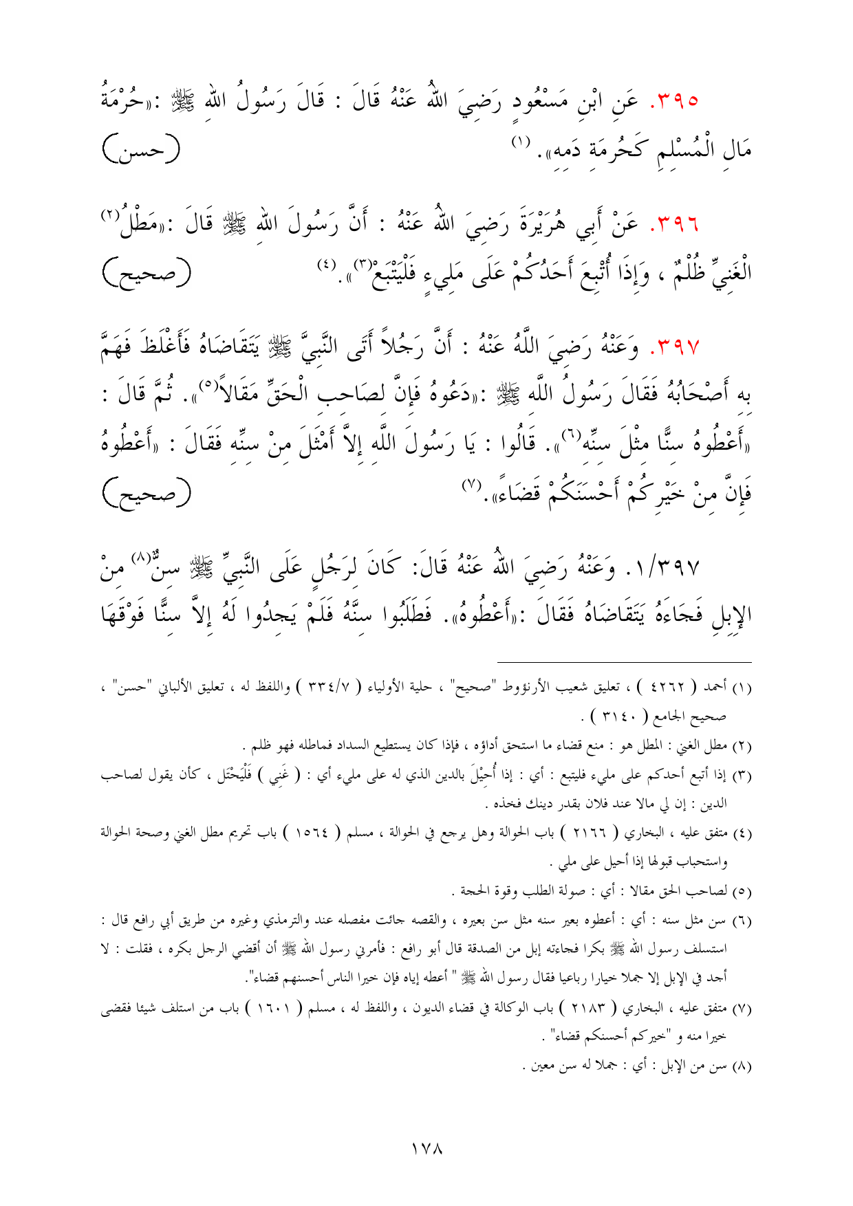397 - وَعَنْهُ رَضِيَ اللَّهُ عَنْهُ: أَنَّ رَجُلاً أَتَى النَّبِيَّ - صلى الله عليه وسلم - يَتَقَاضَاهُ فَأَغْلَظَ فَهَمَّ بِهِ أَصْحَابُهُ فَقَالَ رَسُولُ اللَّهِ - صلى الله عليه وسلم -: «دَعُوهُ فَإِنَّ لِصَاحِبِ الْحَقِّ مَقَالاً (¬5)». ثُمَّ قَالَ: «أَعْطُوهُ سِنًّا مِثْلَ سِنِّهِ (¬6)». قَالُوا: يَا رَسُولَ اللَّهِ إِلاَّ أَمْثَلَ مِنْ سِنِّهِ فَقَالَ: «أَعْطُوهُ فَإِنَّ مِنْ خَيْرِكُمْ أَحْسَنَكُمْ قَضَاءً». (¬7) =صحيح