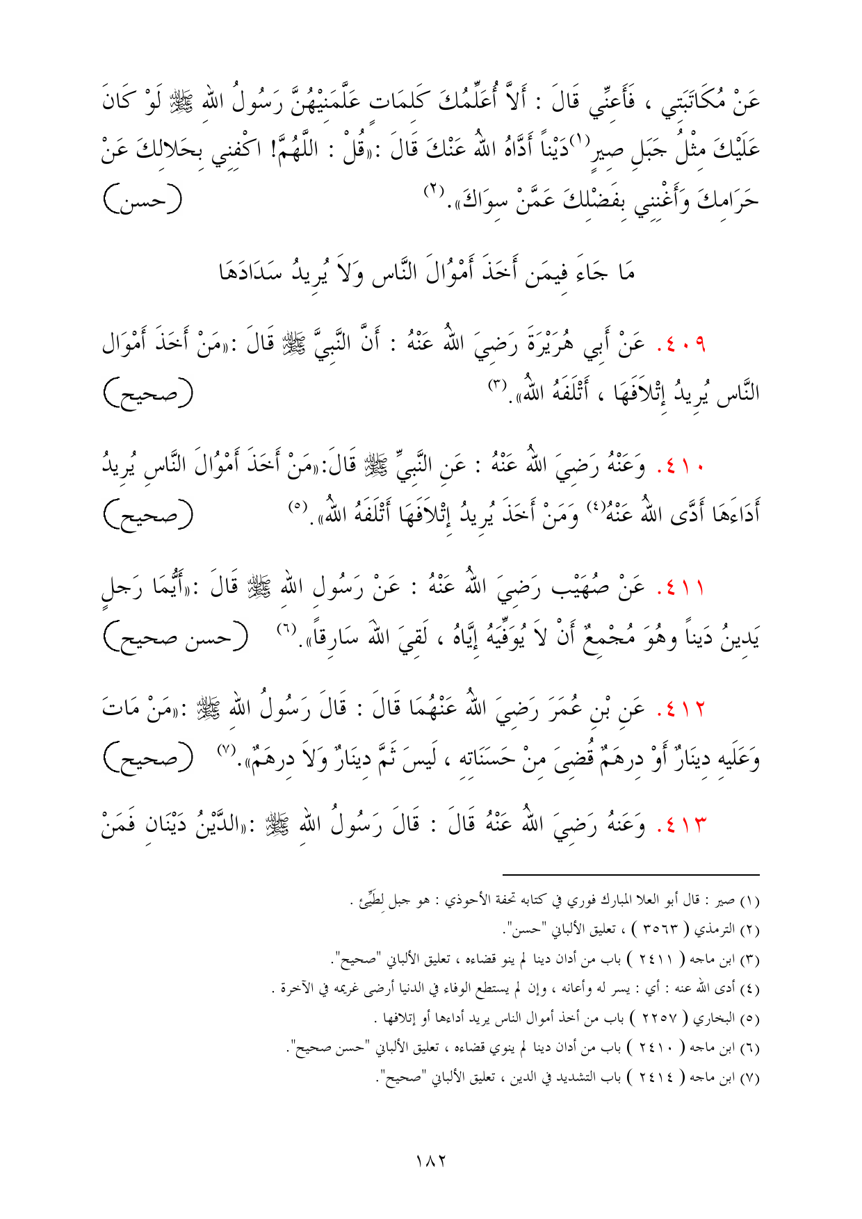 410 - وَعَنْهُ رَضِيَ اللهُ عَنْهُ: عَنِ النَّبِيِّ - صلى الله عليه وسلم - قَالَ: «مَنْ أَخَذَ أَمْوُالَ النَّاسِ يُرِيدُ أَدَاءَهَا أَدَّى اللهُ عَنْهُ (¬4) وَمَنْ أَخَذَ يُرِيدُ إِتْلاَفَهَا أَتْلَفَهُ اللهُ». (¬5) =صحيح