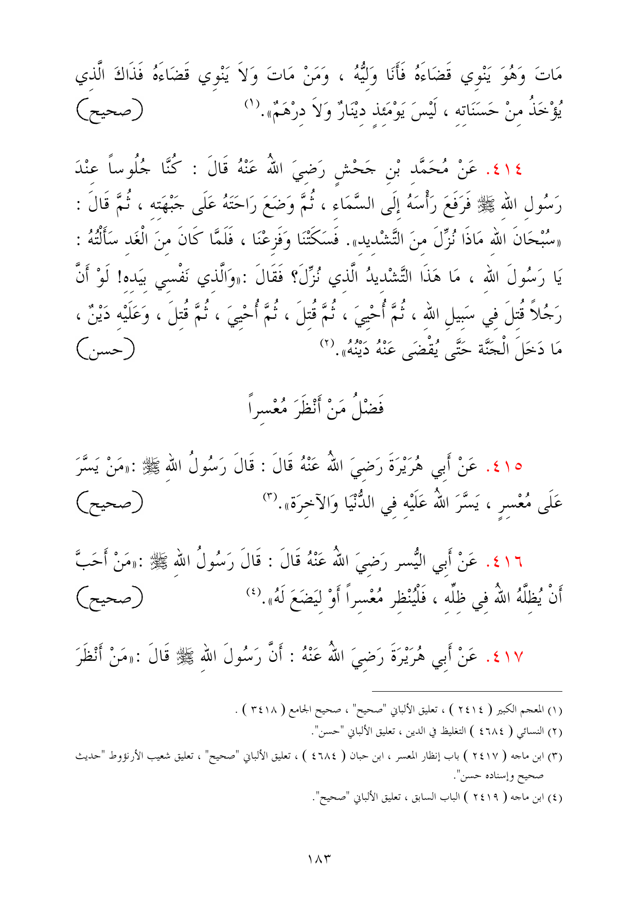 416 - عَنْ أَبِي اليُّسر رَضِيَ اللهُ عَنْهُ قَالَ: قَالَ رَسُولُ اللهِ - صلى الله عليه وسلم -: «مَنْ أَحَبَّ أَنْ يُظِلَّهُ اللهُ فِي ظِلِّهِ، فَلْيُنْظِر مُعْسِراً أَوْ لِيَضَعَ لَهُ». (¬4) =صحيح