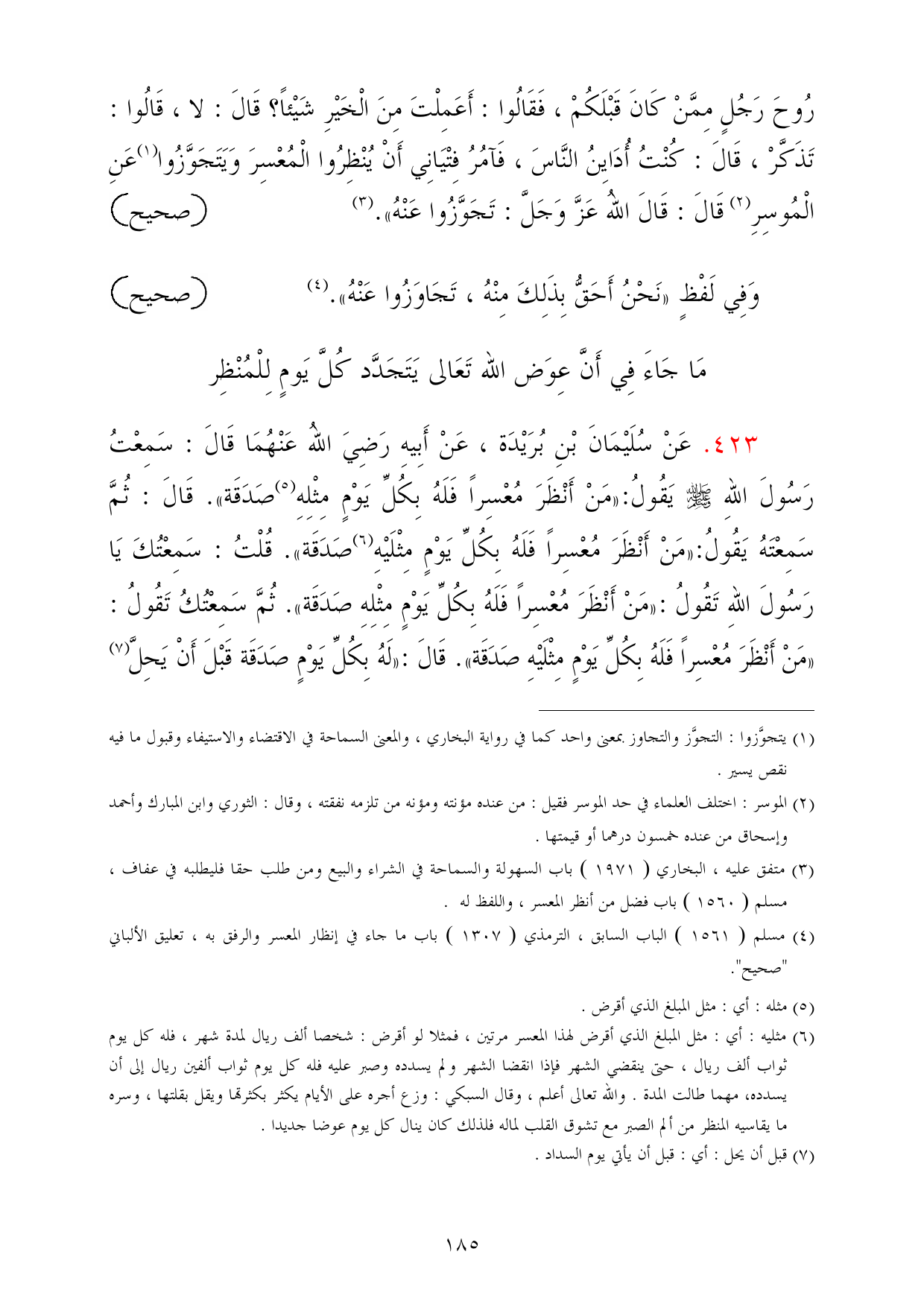 423 - عَنْ سُلَيْمَانَ بْنِ بُرَيْدَة، عَنْ أَبِيهِ رَضِيَ اللهُ عَنْهُمَا قَالَ: سَمِعْتُ رَسُولَ اللهِ - صلى الله عليه وسلم - يَقُولُ: «مَنْ أَنْظَرَ مُعْسِراً فَلَهُ بِكُلِّ يَوْمٍ مِثْلِهِ (¬5) صَدَقَة». قَالَ: ثُمَّ سَمِعْتَهُ يَقُولُ: «مَنْ أَنْظَرَ مُعْسِراً فَلَهُ بِكُلِّ يَوْمٍ مِثْلَيْهِ (¬6) صَدَقَة». قُلْتُ: سَمِعْتُكَ يَا رَسُولَ اللهِ تَقُولُ: «مَنْ أَنْظَرَ مُعْسِراً فَلَهُ بِكُلِّ يَوْمٍ مِثْلِهِ صَدَقَة». ثُمَّ سَمِعْتُكُ تَقُولُ: «مَنْ أَنْظَرَ مُعْسِراً فَلَهُ بِكُلِّ يَوْمٍ مِثْلَيْهِ صَدَقَة». قَالَ: «لَهُ بِكُلِّ يَوْمٍ صَدَقَة قَبْلَ أَنْ يَحِلَّ (¬7)