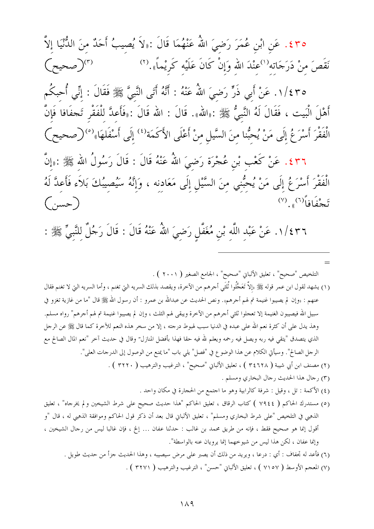 435/ 1. عَنْ أَبِي ذَرٍّ رَضِيَ اللهُ عَنْهُ: أَنَّهُ أَتَى النَّبِيَّ - صلى الله عليه وسلم - فَقَالَ: إِنِّي أُحِبكُم أَهْلَ الْبَيت، فَقَالَ لَهُ النَّبِيُّ - صلى الله عليه وسلم -: «الله». قَالَ: الله قَالَ: «فَأَعِدَّ لِلْفَقْرِ تَجفَافا فَإِنَّ الْفَقْرَ أَسْرَعُ إِلَى مَنْ يُحِبُّنا مِنَ السَّيلِ مِنْ أَعْلَى الأَكَمَة (¬4) إِلَى أَسْفَلهَا» (¬5) =صحيح